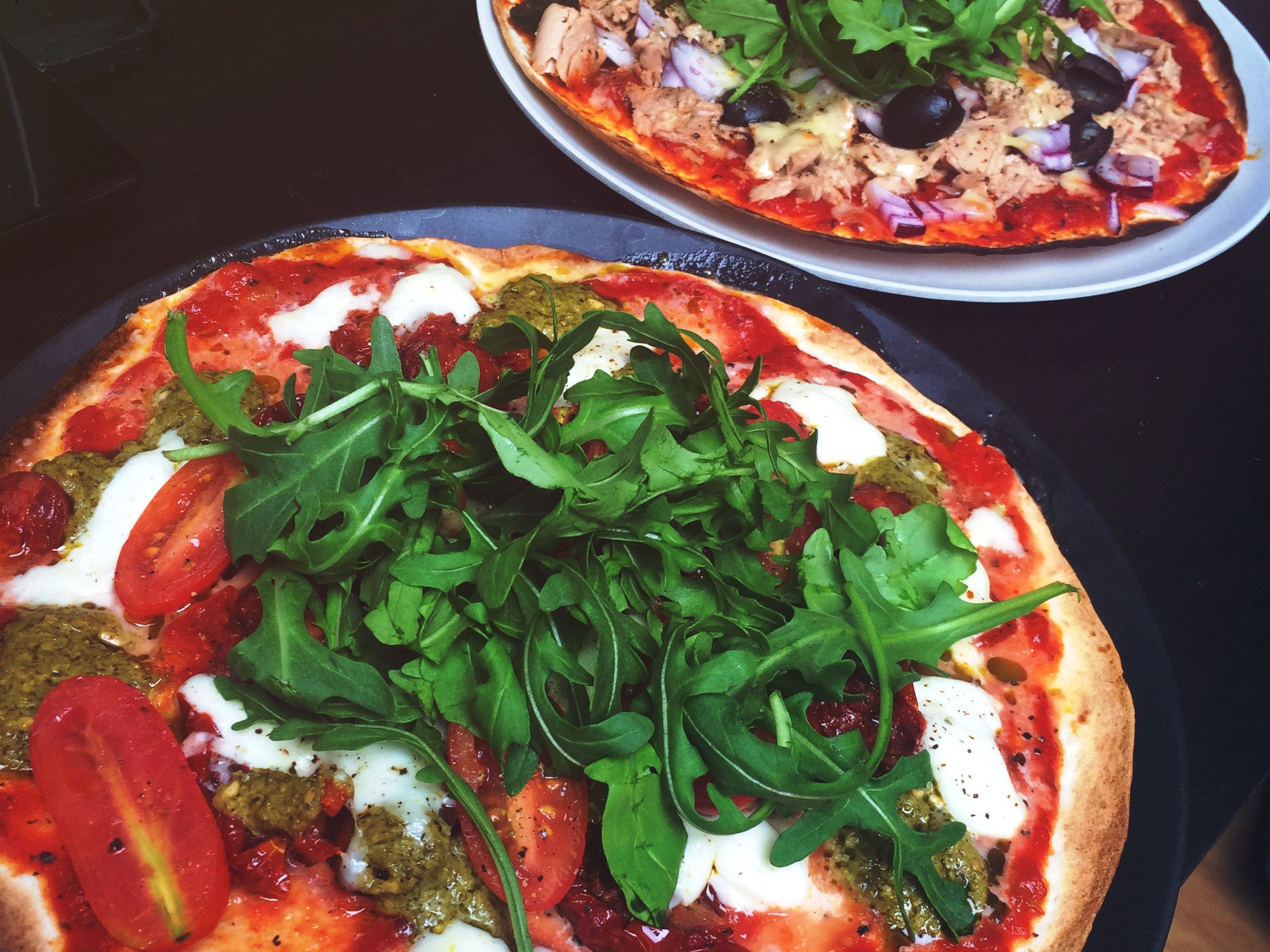 -Whatever toppings you want: I made one pesto, chorizo, sundried tomatoes, olives, mozerella and rocket pizza and one tuna, black olives, red onion, cherry tomato, cheddar and rocket pizza