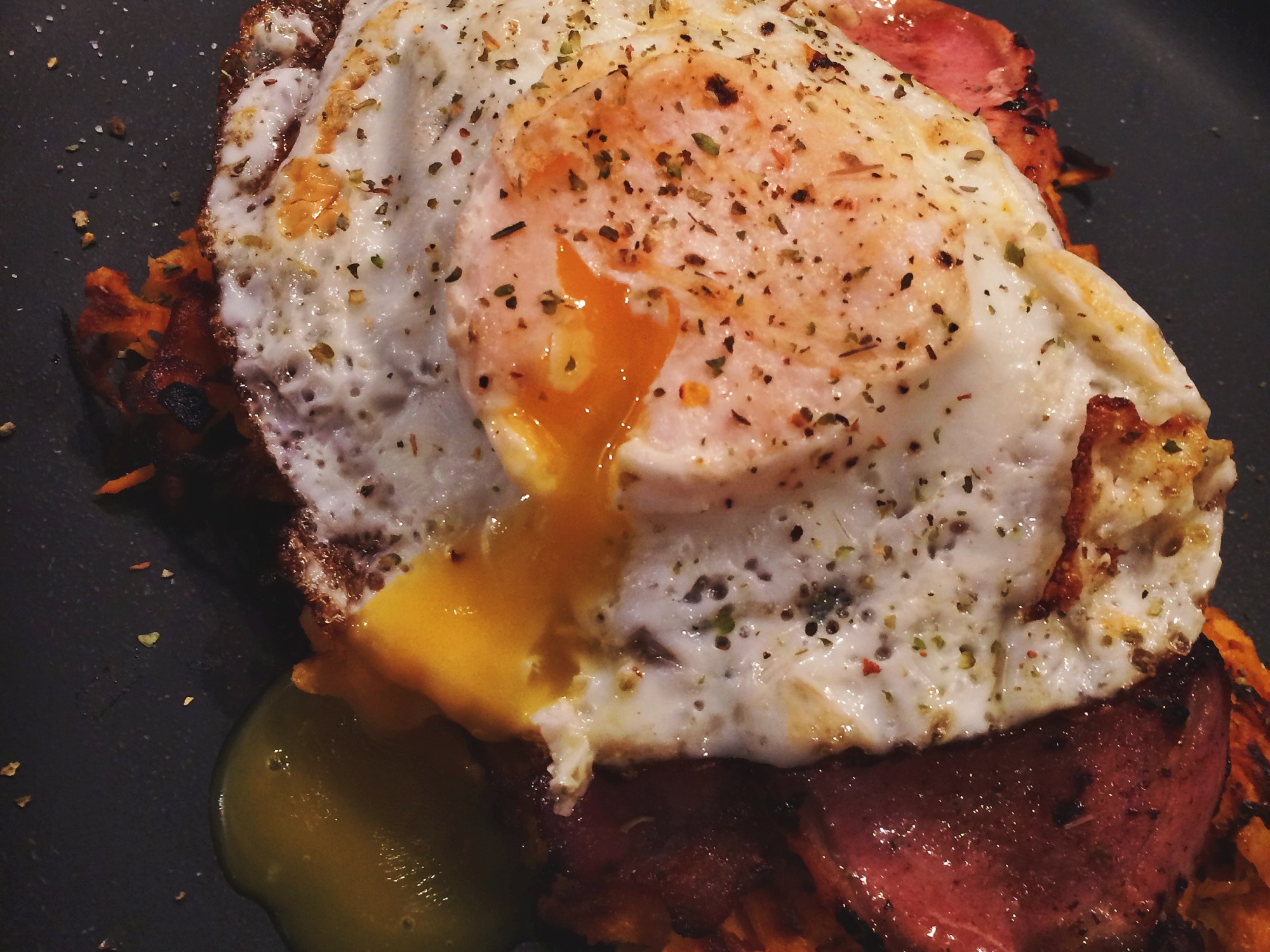 8) Put the sweet potato hash browns down to cook on one side, in batches (depending on how big your pan is). Leave for about 4-5 minutes until crispy.