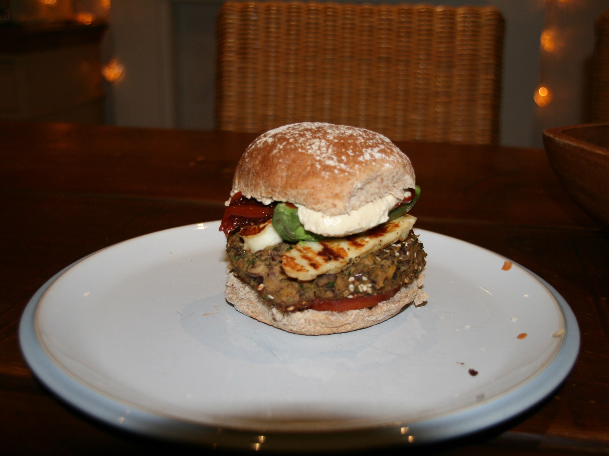 5) Fill up your burger. I put tomatoes, grilled halloumi, avocado, fried chorizo and hummous in mine.