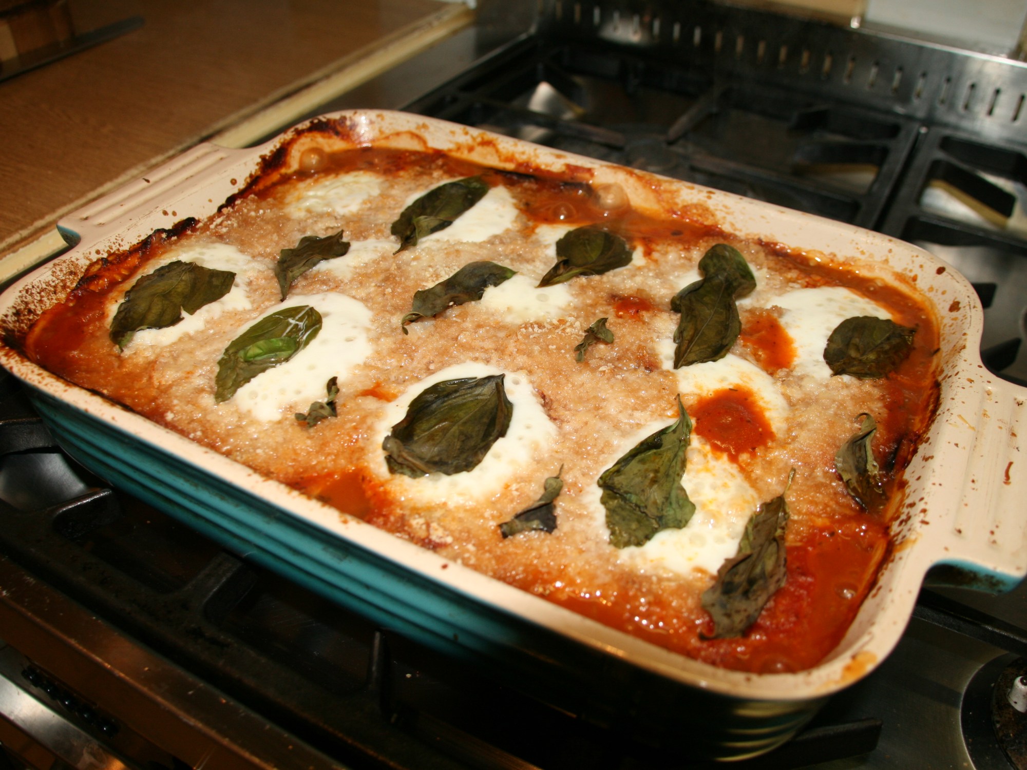 13. Then add a layer of tomato sauce. Then repeat this process until the top of the dish.14. Sprinkle over the breadcrumbs (optional) , then parmesan.15. Then add the mozerella and basil leaves.