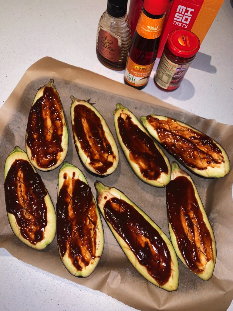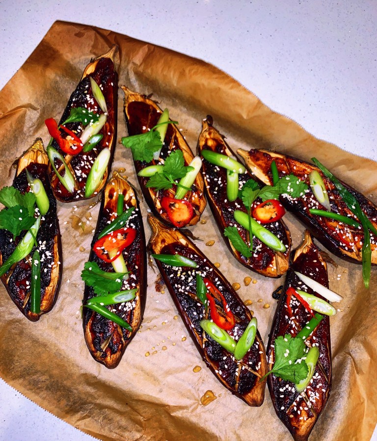 ‘Nash Dengaku’ is a Japanese dish of a soft miso glazed aubergine. Adding the miso and honey gives a perfect sweet and salty flavour to this low-carb meal.