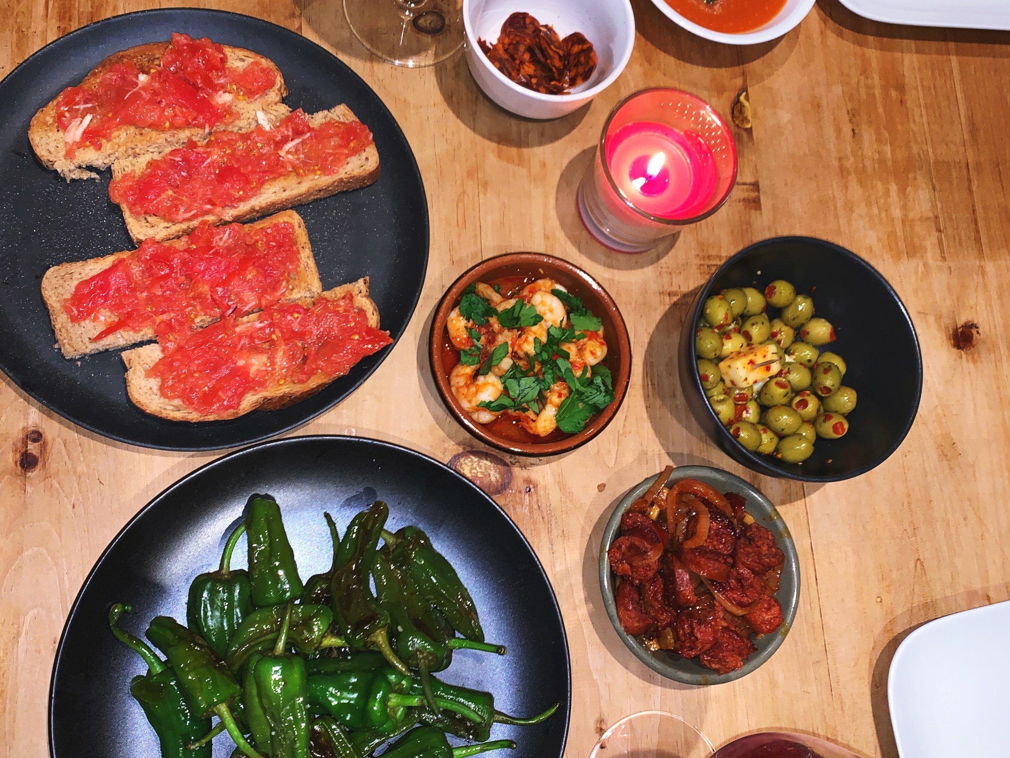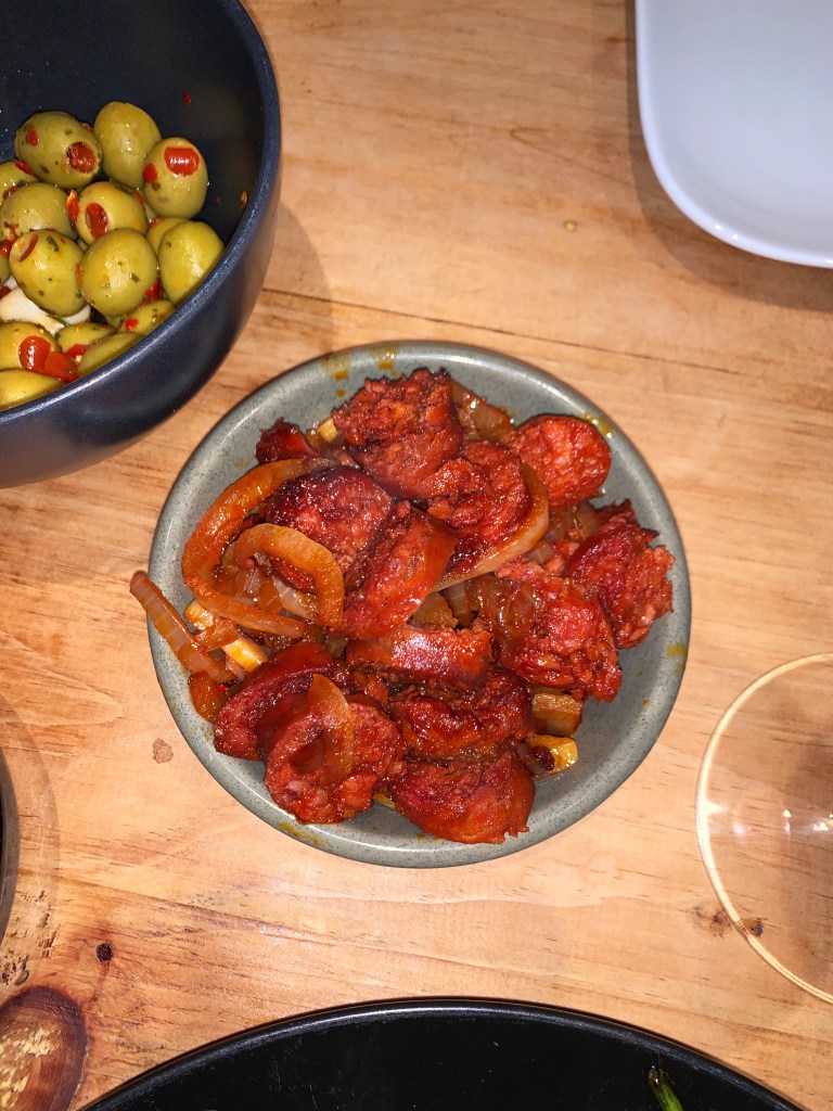 Tapas is a lovely thing where you can pick at different foods whilst having a drink. Below are the recipes for a chorizo dish, prawn dish, padron peppers and tomato bread. You can serve these along side olives, sangria and paella.