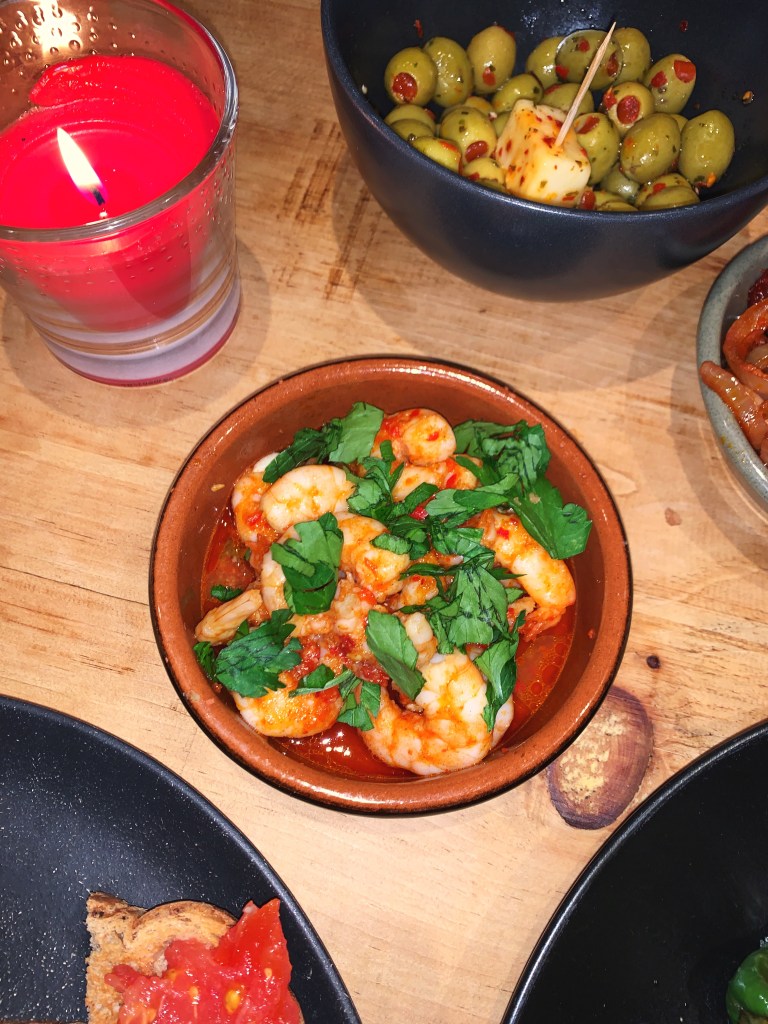 For the Gambas pil pil (sizzling prawns in garlic, chilli and olive oil):
