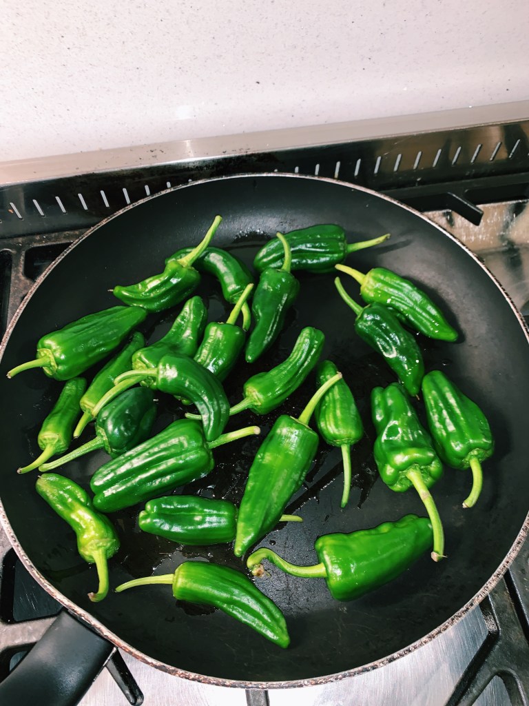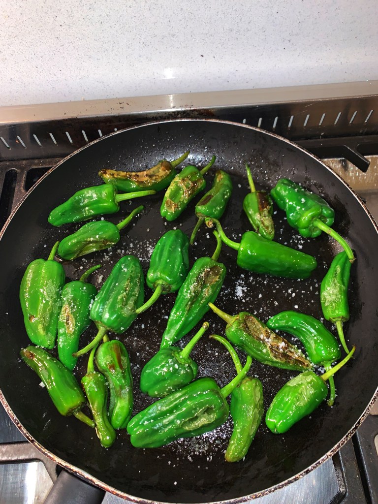 – Simply fry padron peppers in some olive oil until blistered and charred. Then add on a generous amount of sea salt.