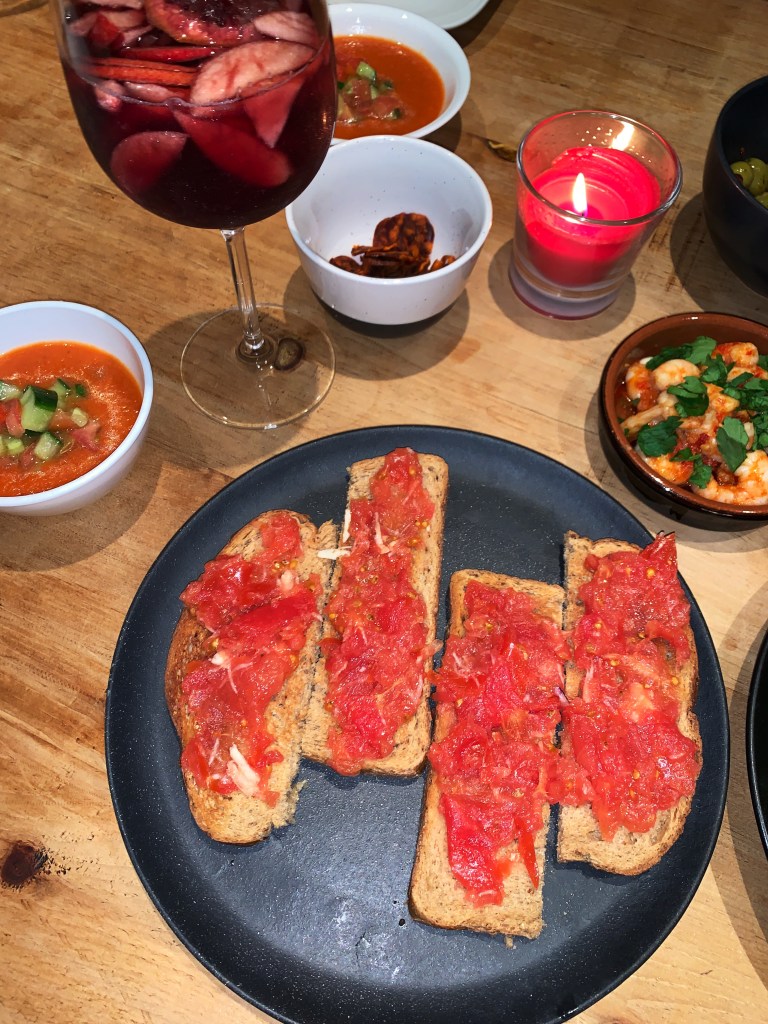 – Grate 2 tomatoes and mix with 3 cloves of grated garlic. Add salt and olive oil. Spread onto bread.