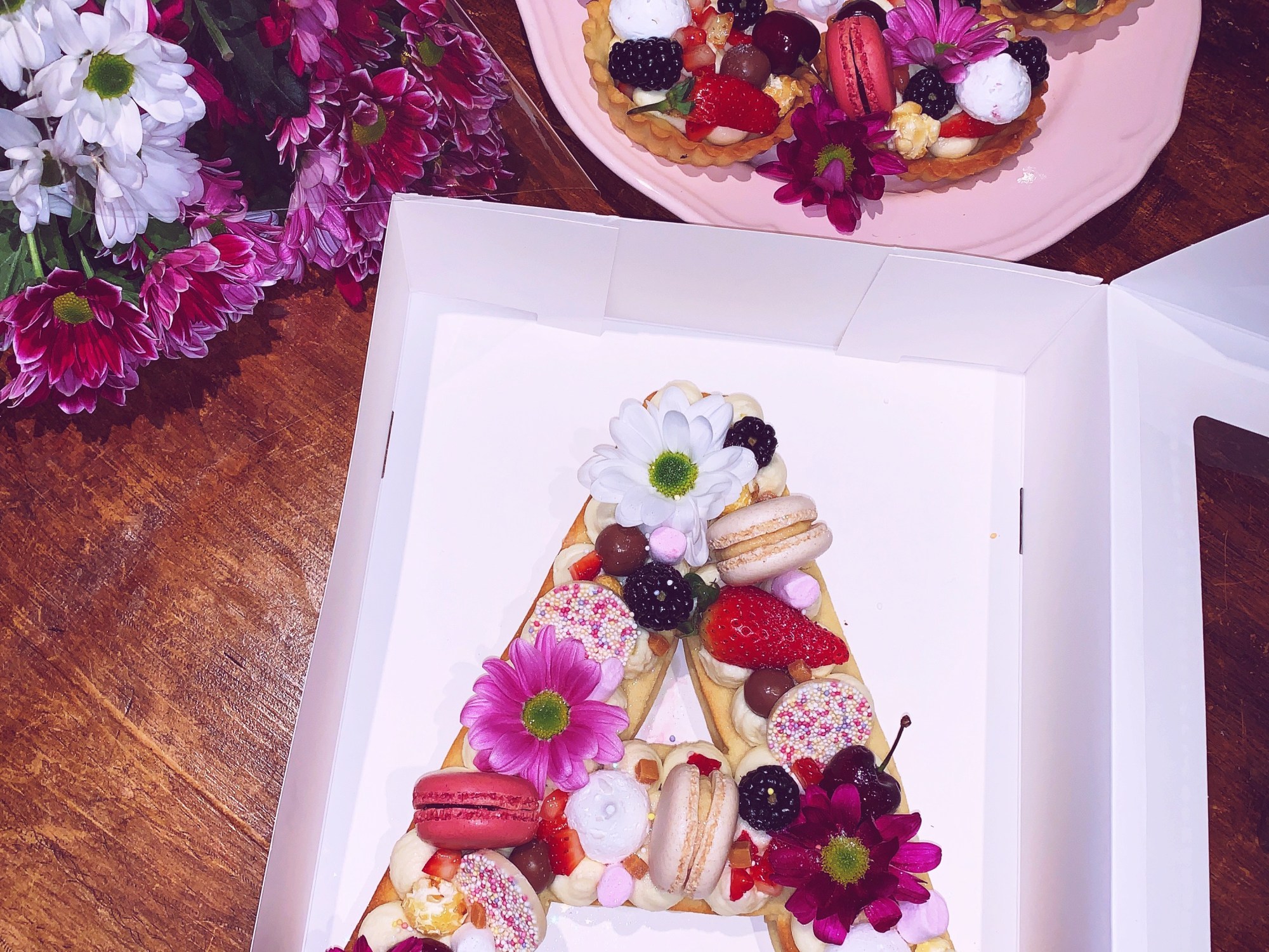 Alphabet/ number ‘cakes’ have been a recent Instagram craze throughout 2018. They look beautiful and are the perfect celebration showstopper. However, they are not ‘cakes’ but more a reconstructed fruit tart- I made mine using 2 almond & vanilla pastry tart bases, sandwiched with a mascarpone vanilla cream filling and topped with fresh fruit, macarons and other goodies. I have done the letter A today for my friend’s birthday, but you can do any number/ letter/ initials. You could even make shapes such as a heart for valentine’s day or a ring shape for an engagement gift- the principal is still the same. I have decorated this cake with pretty pink treats but you can use whatever you want- to personalise the cake even further. I have overdone the quantity of pastry and cream, as you may be making 2 letters, or 2 numbers- today I used the spare mixture to make some small individual tarts.