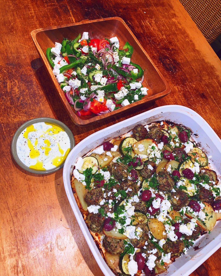 I ate this with a traditional Greek salad- recipe can be found here, and tzatziki dip- a greek cucumber, mint and yoghurt dip (recipe below).