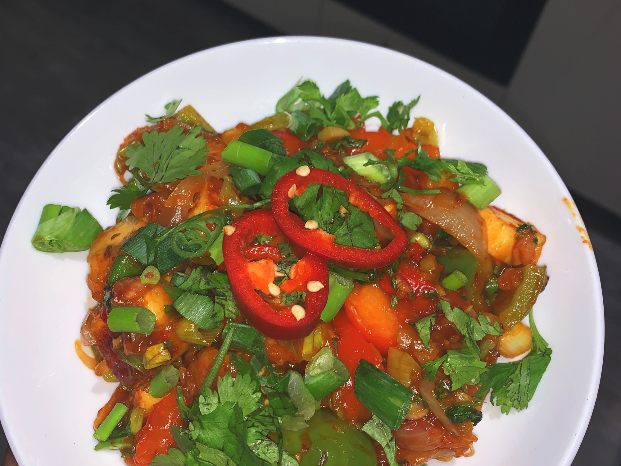 - Sprinkle on the spring onions and coriander.