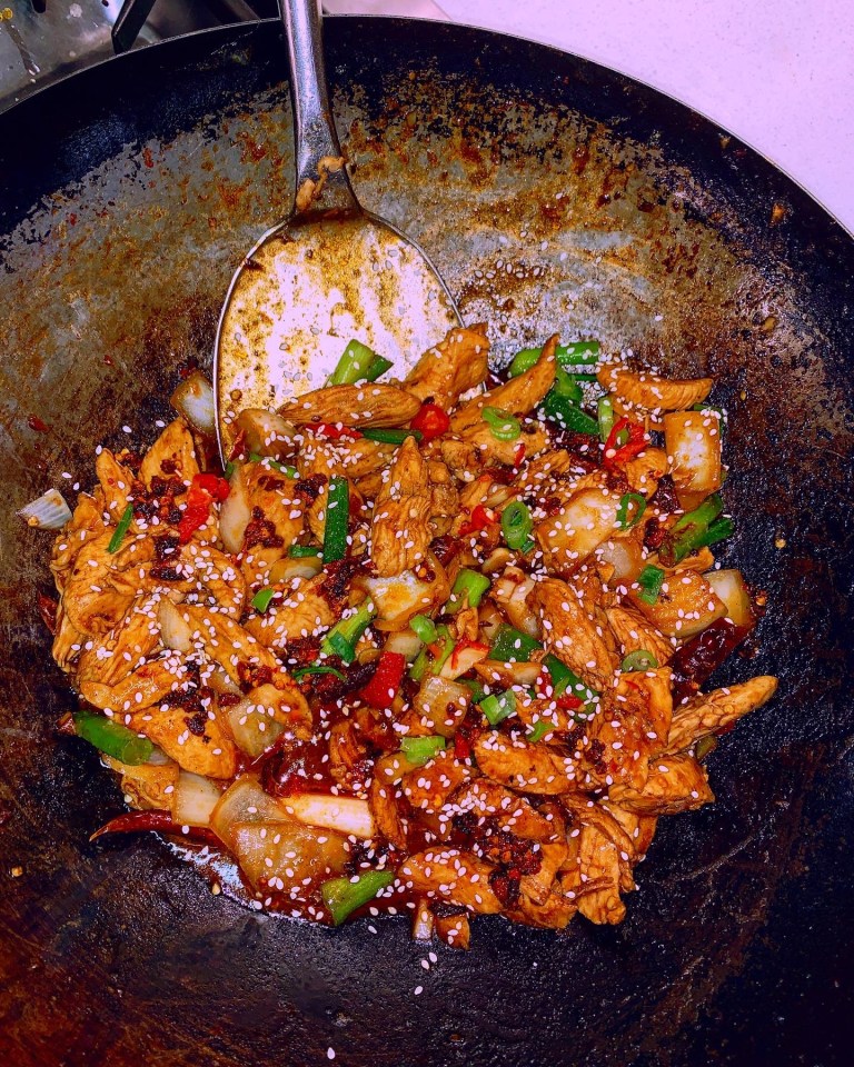 - Heat a wok or large frying pan until hot. Add 2 tbsp oil and throw in the garlic and ginger. Fry for a few seconds until fragrant.