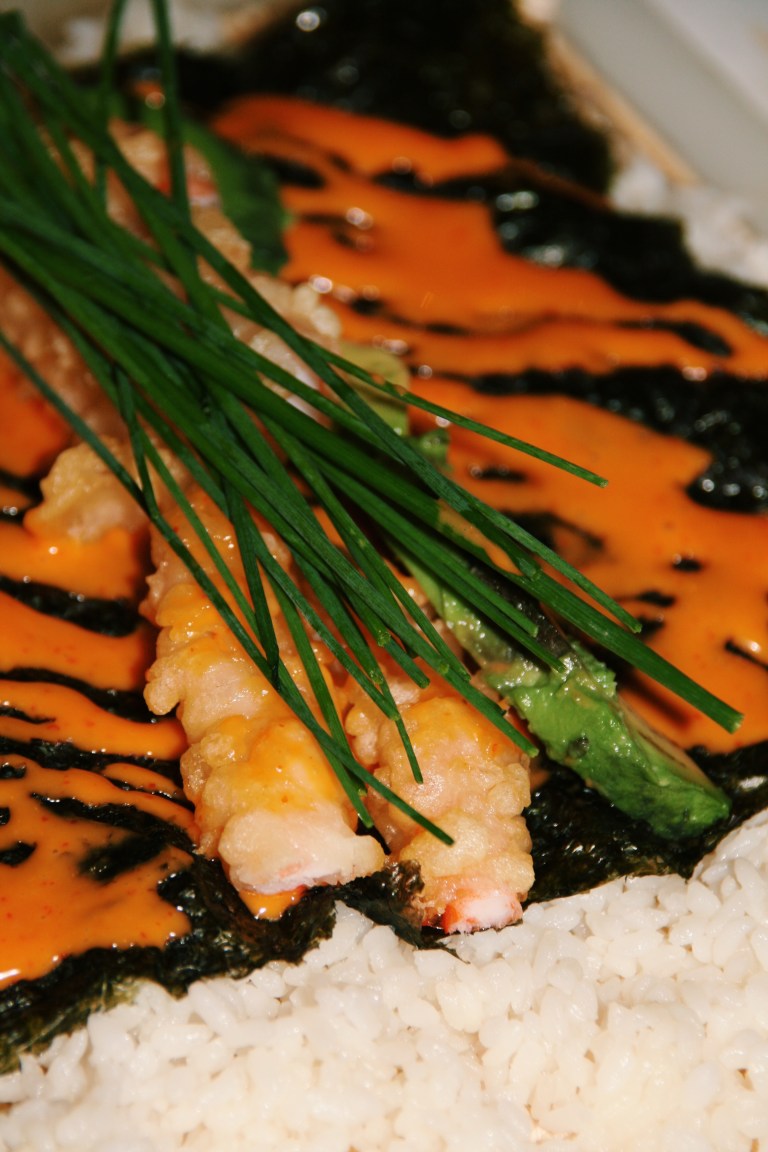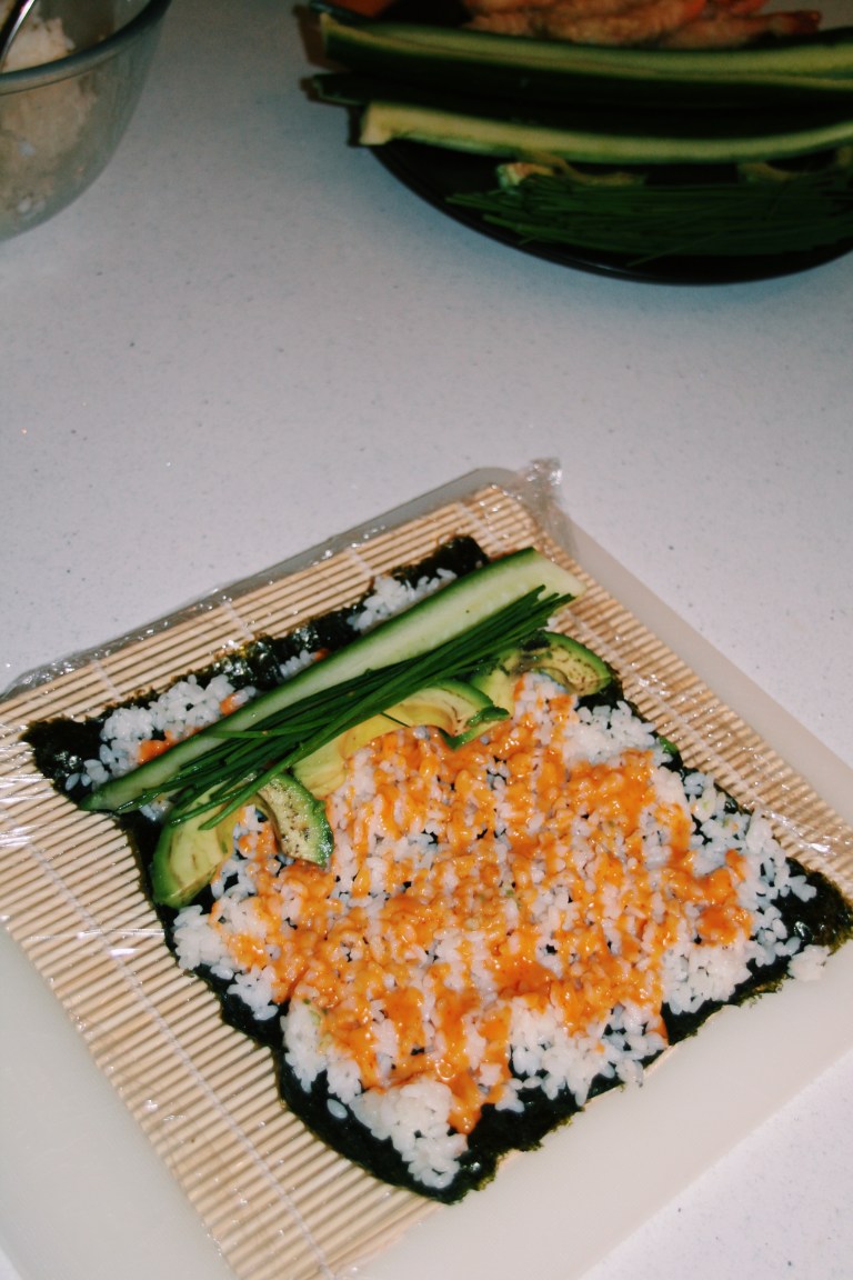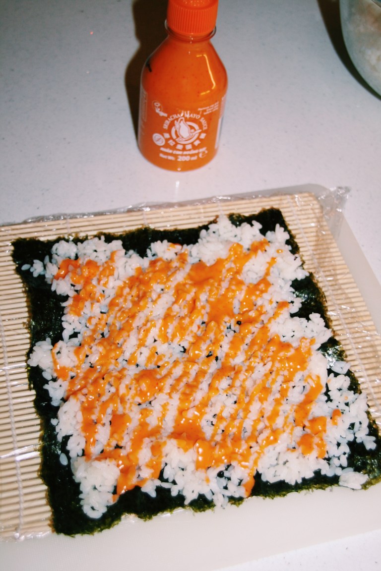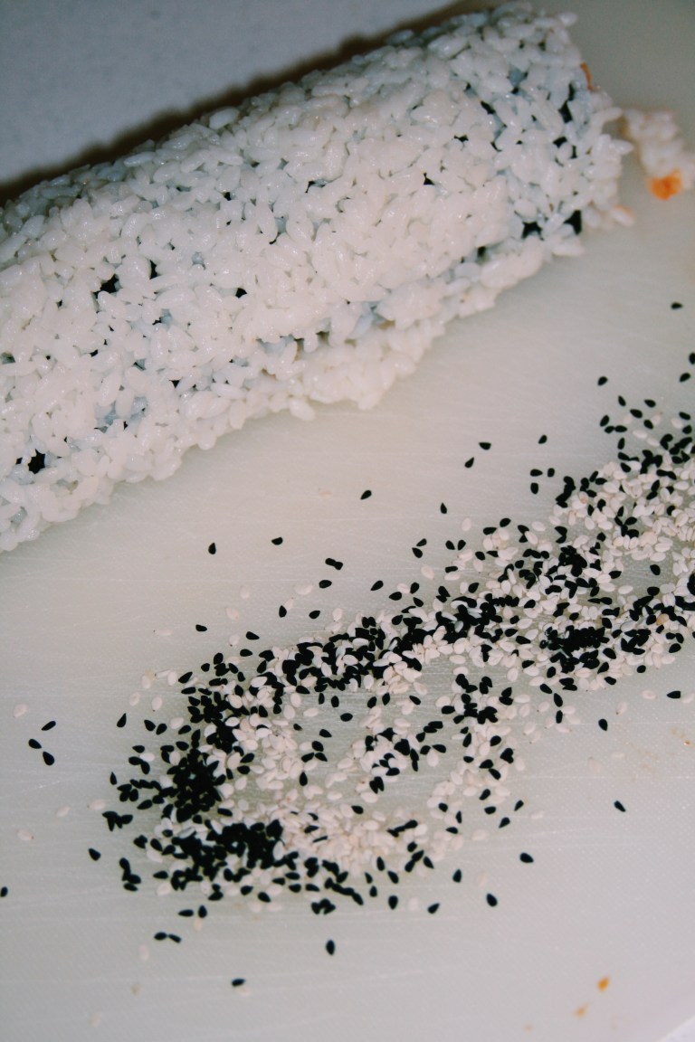 - For the tempura prawn one (California type) /rice on the outside: instead of putting the nori first, put the rice first on the mat then the nori on top. Add the sriracha mayo and fill it, then roll in the same way. I cover the outside with black and white sesame seeds too.