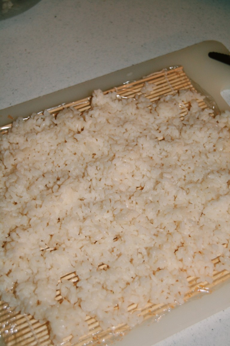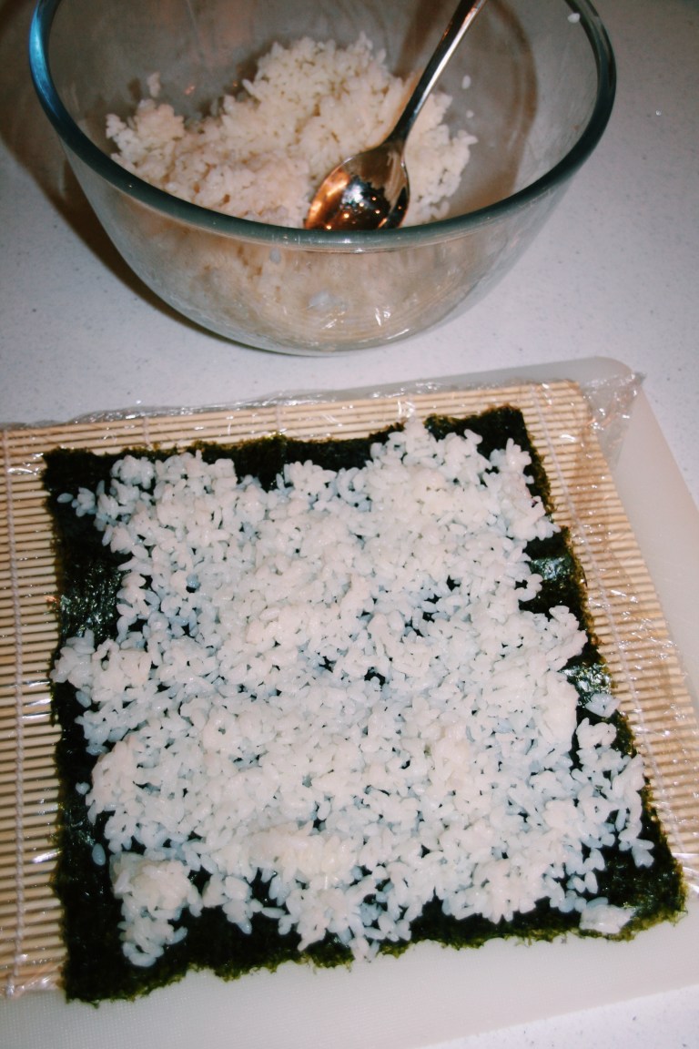 - Cover the sheet with rice, until about 3 grains deep. You should still see some of the nori sheet poking out from underneath.