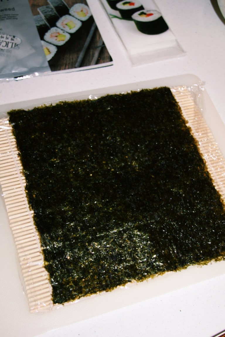 - To make the veggie and salmon rolls, place a nori sheet over the cling filmed mat. There are 2 sides to the sheet- a rough and smooth one. Place the smooth side down, to look better and also to allow the rough side to stick to the rice.