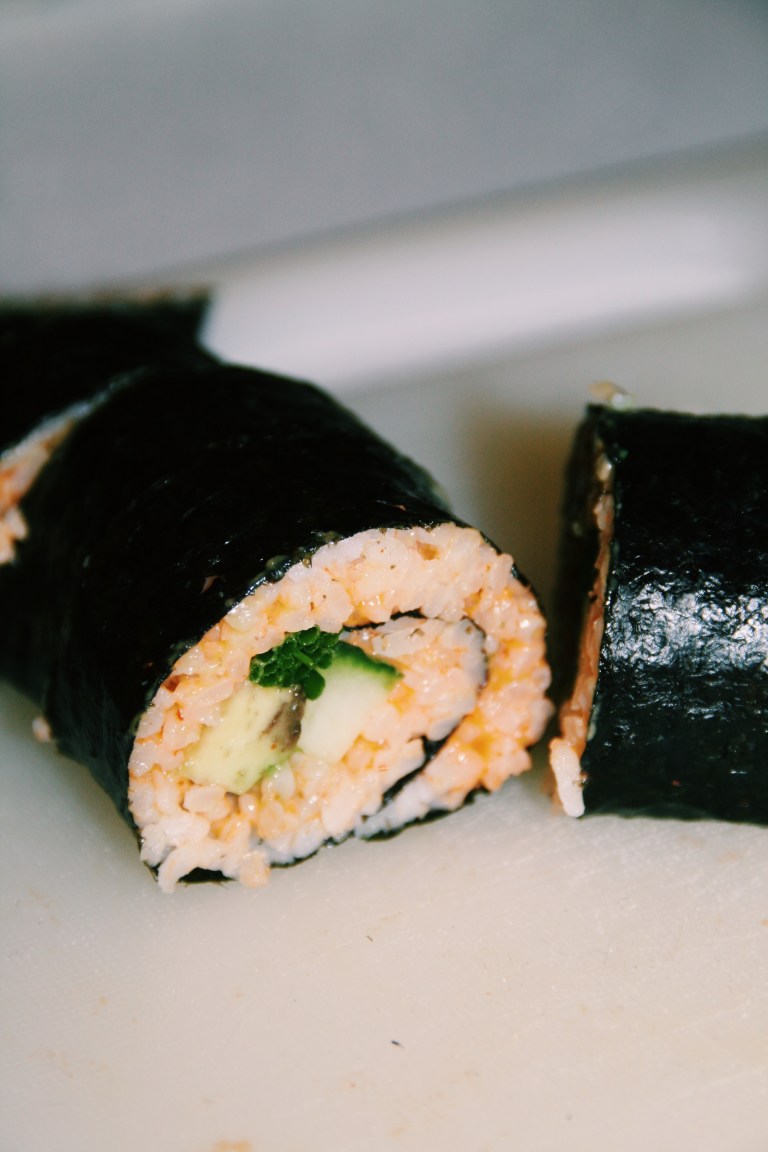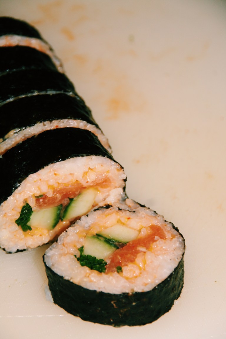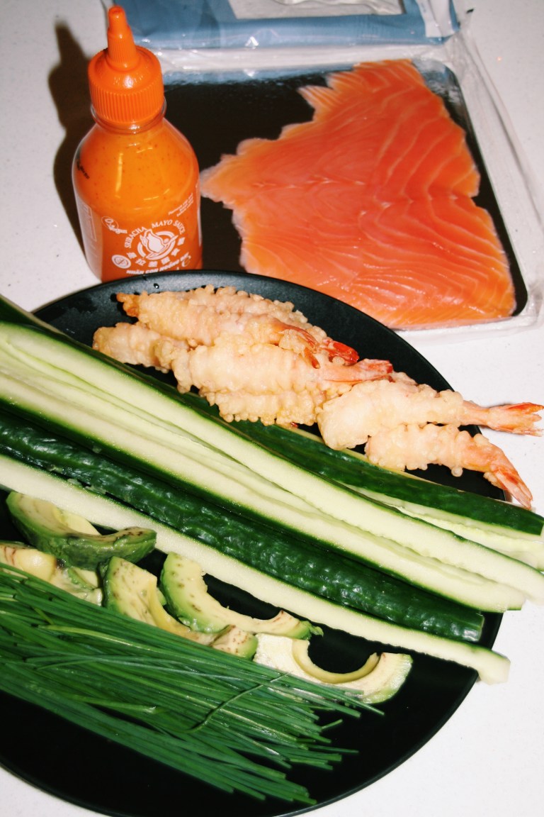 Sushiiiii- so on trend at the moment, but can often be so expensive!! Here is a super quick way in which you can make sushi at home. I have made one veggie avocado & cucumber roll, one salmon & cucumber roll and one tempura prawn & avocado California roll. You do need a few special ingredients to make this, but I got all of my ingredients from Tesco/ Waitrose, so they are readily available. You can use whatever fillings that you want, I have added spicy sriracha mayo to all of mine as it gives it such a nice flavour.