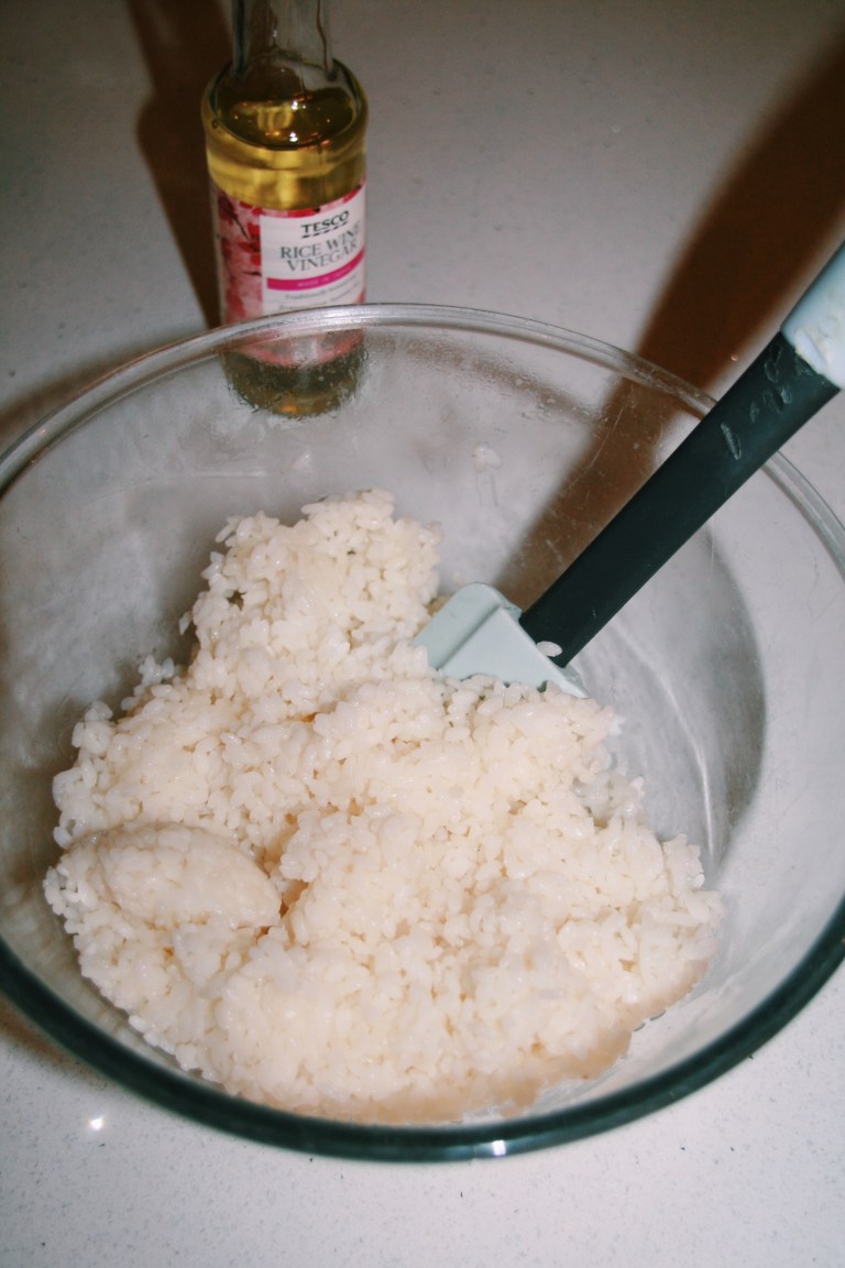 - Firstly start by making the sushi rice. Cook it according to packet instructions. Add 2 tbsp rice wine vinegar, then put in the fridge to cool it more quickly.