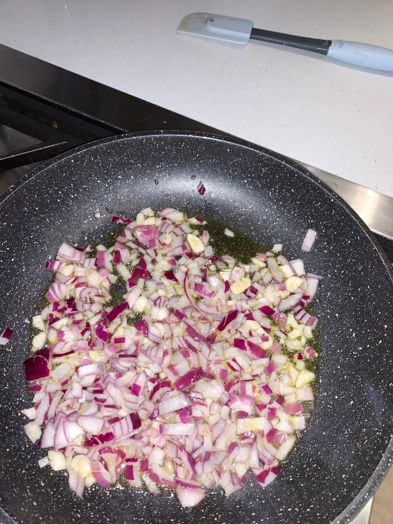 2. Add the onion and garlic to the olive oil and sauté for about 3-5 mins.