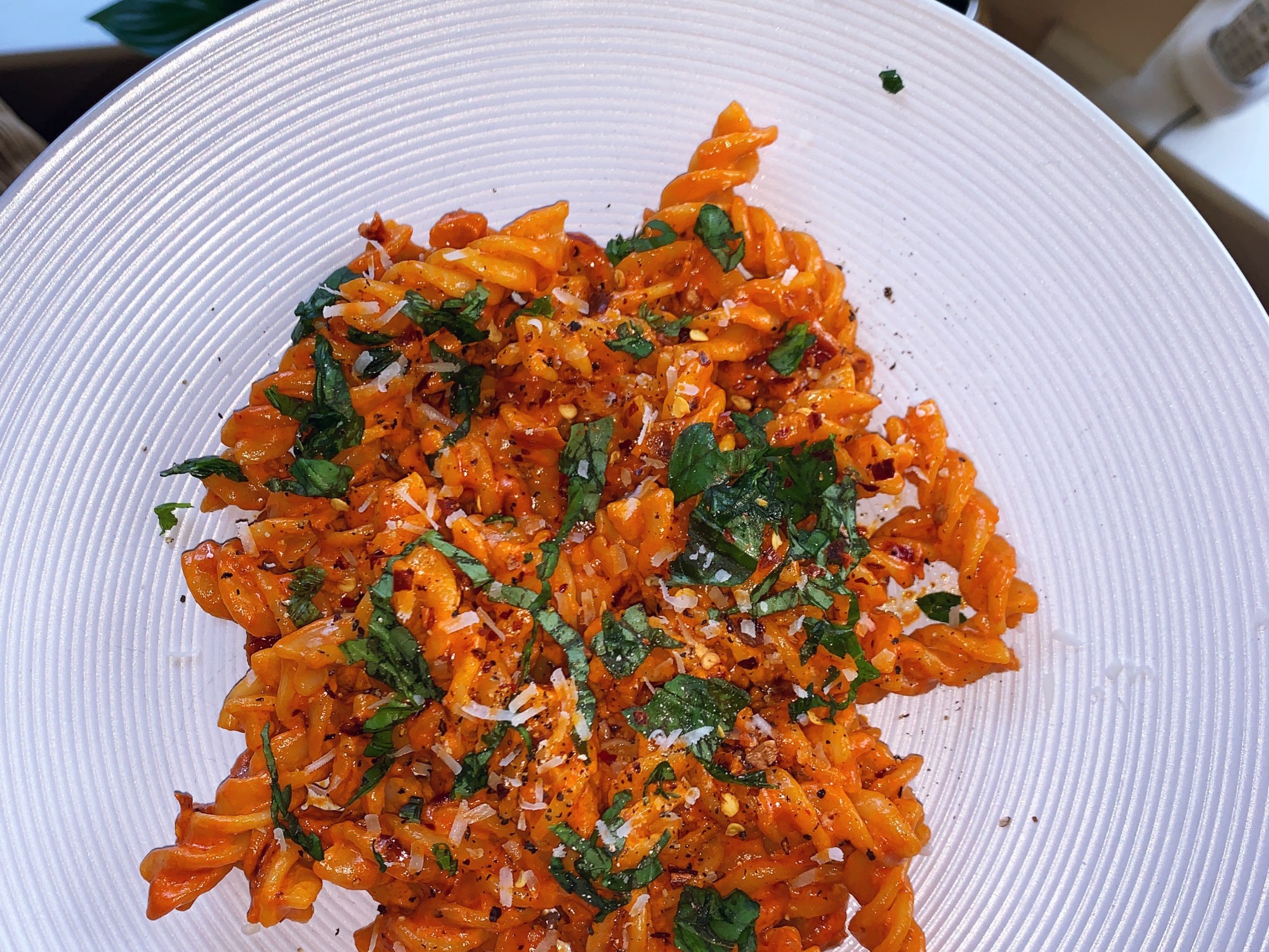 4. Add in the cream and mix until all incorporated. Add the chilli flakes and season.