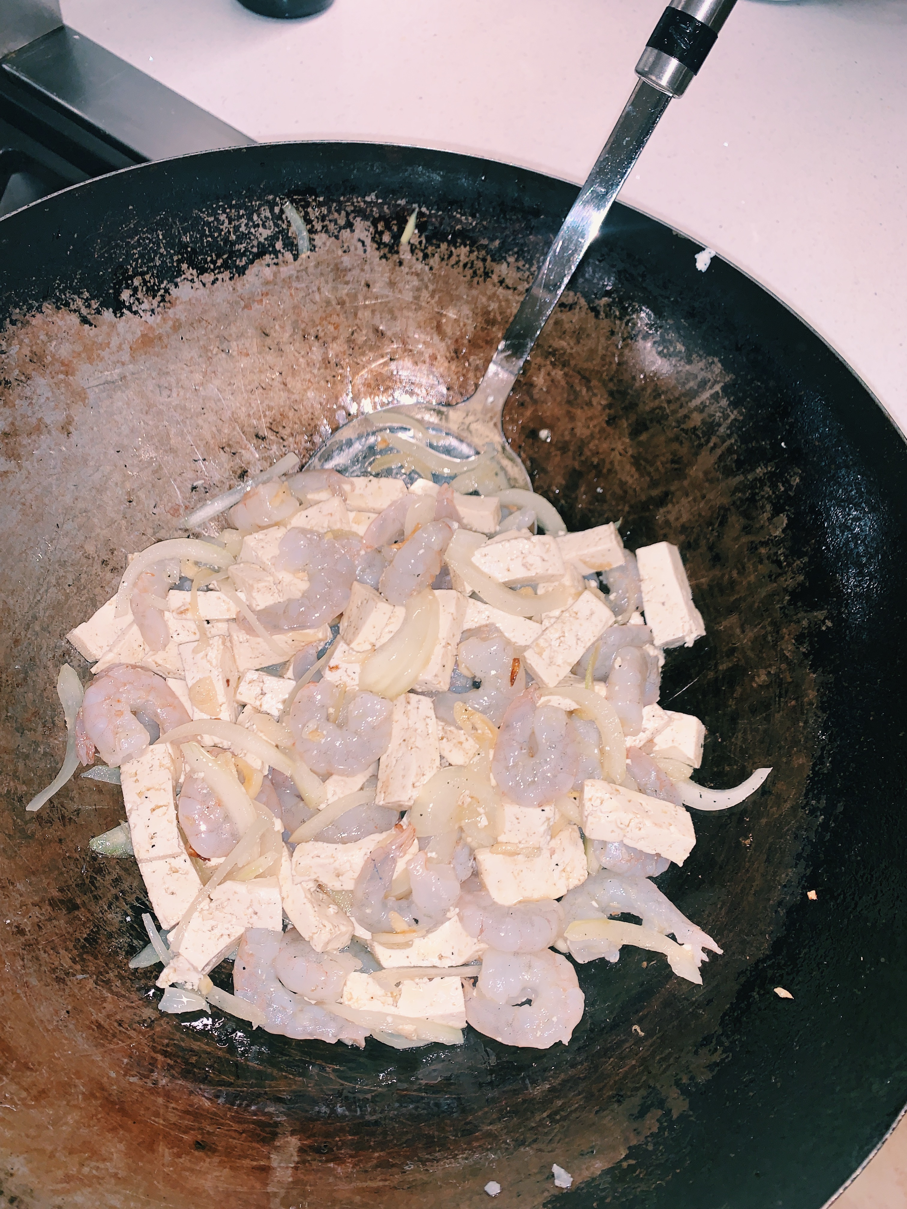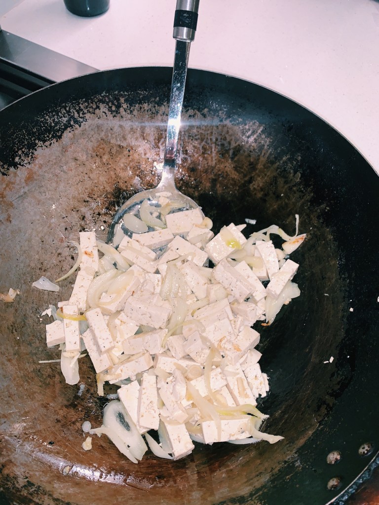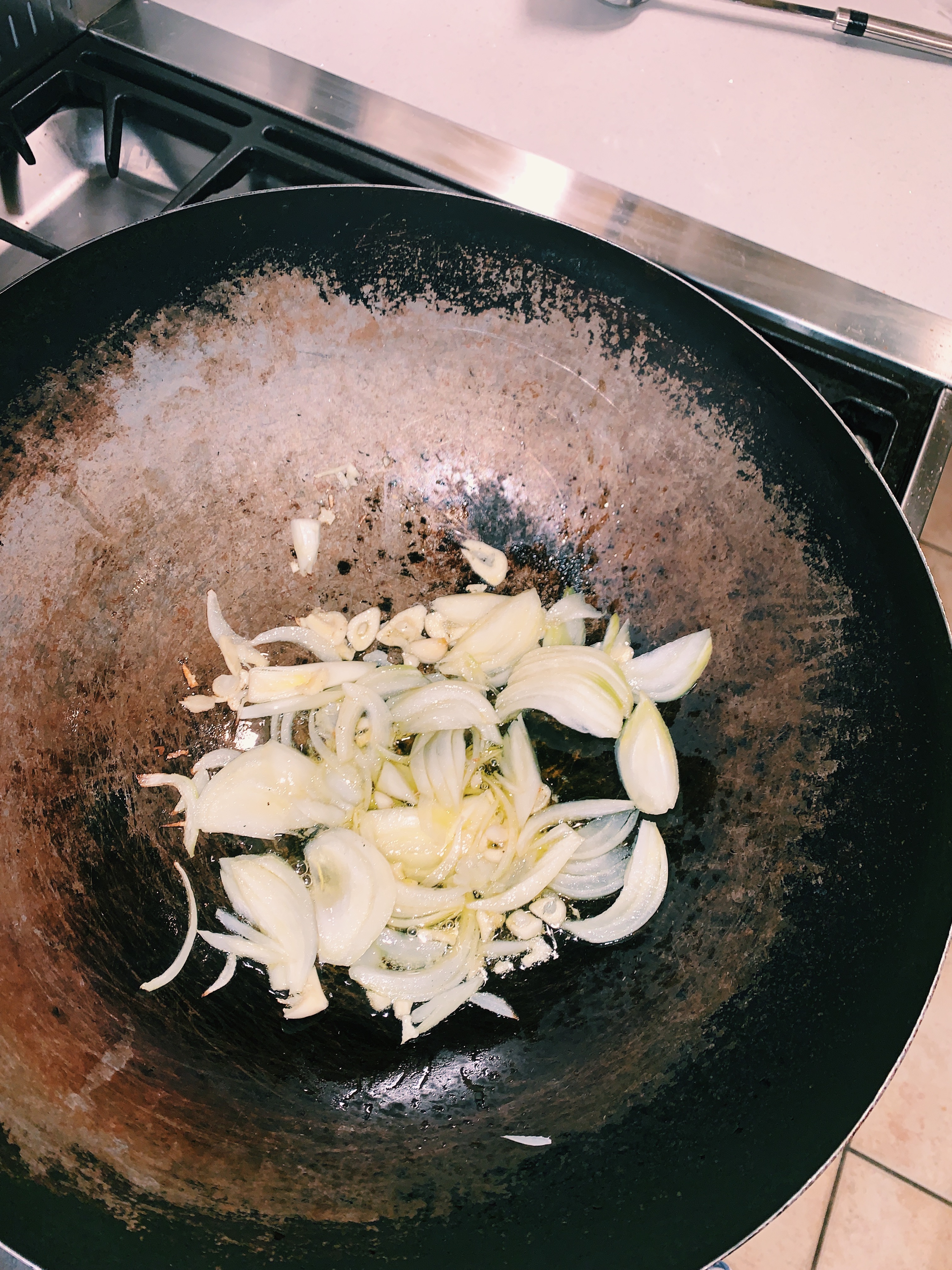 2. Heat the oil in a wok or pan and add the onion and garlic
