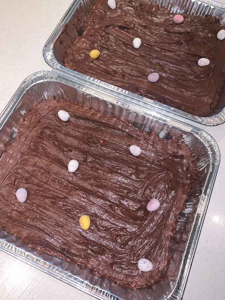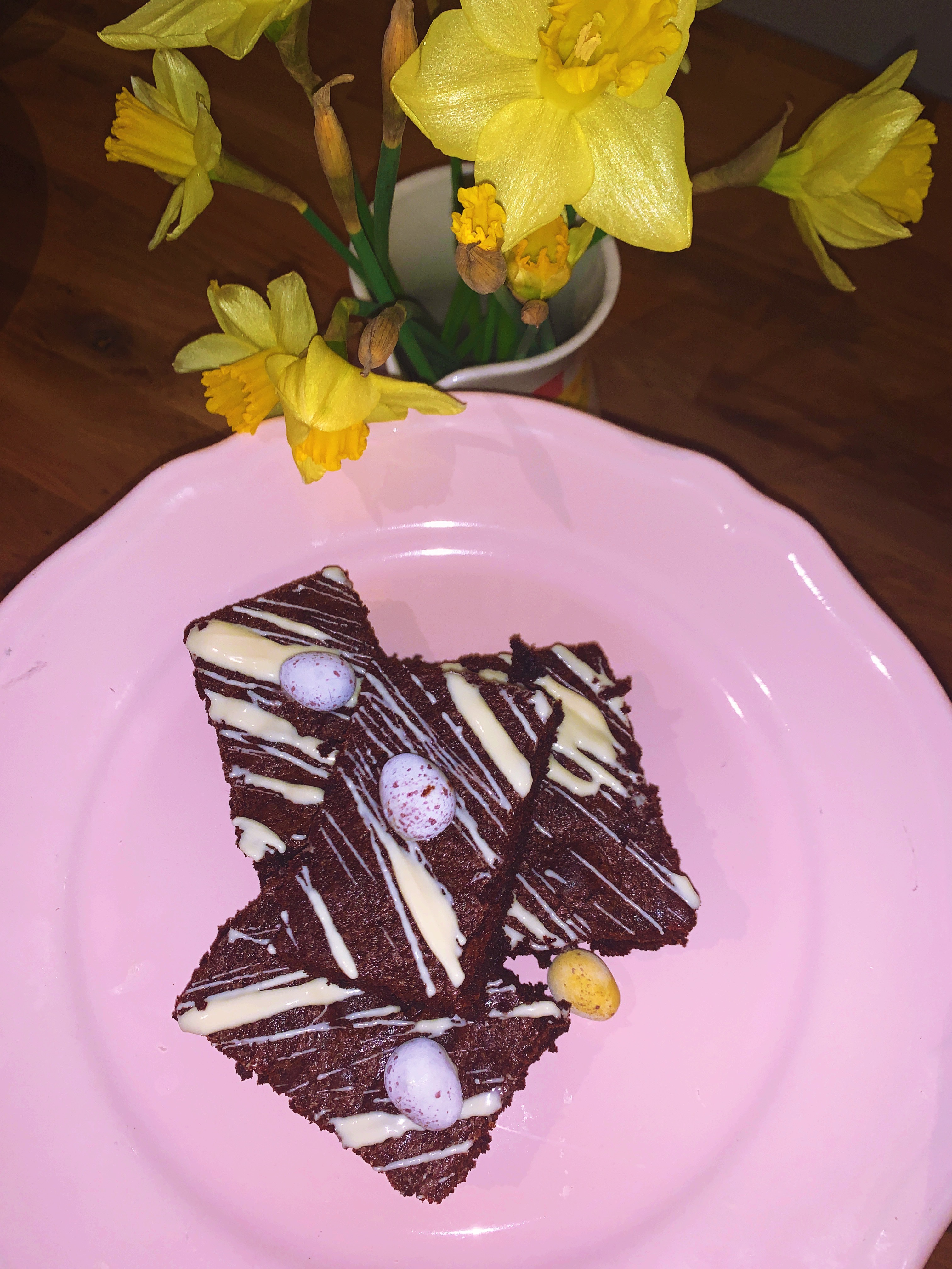 11. Drizzle on top of the brownies then add the extra mini eggs.