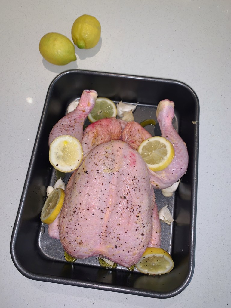 - Get your chicken and rub with olive oil, salt and pepper. Add the lemon slices and bulb of garlic. Put back in the fridge for an hour or so.