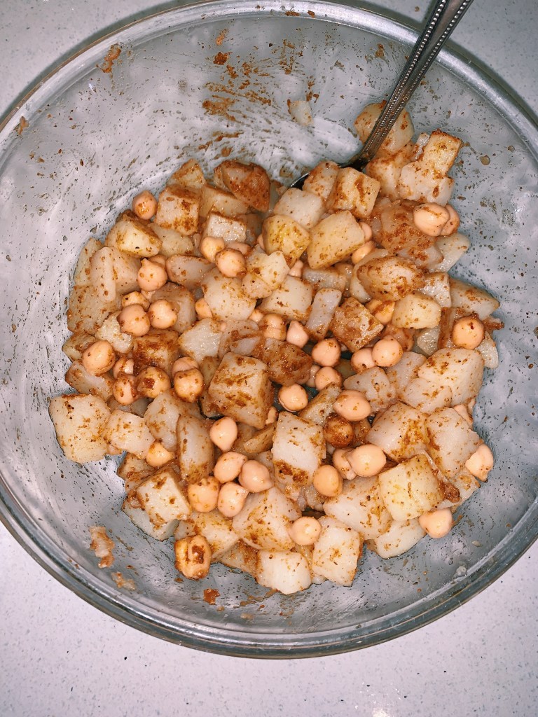 - Mix the cubed cooked potatoes and drained chickpeas with around 2 tbsp of the chaat masala or to taste.