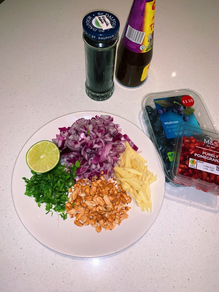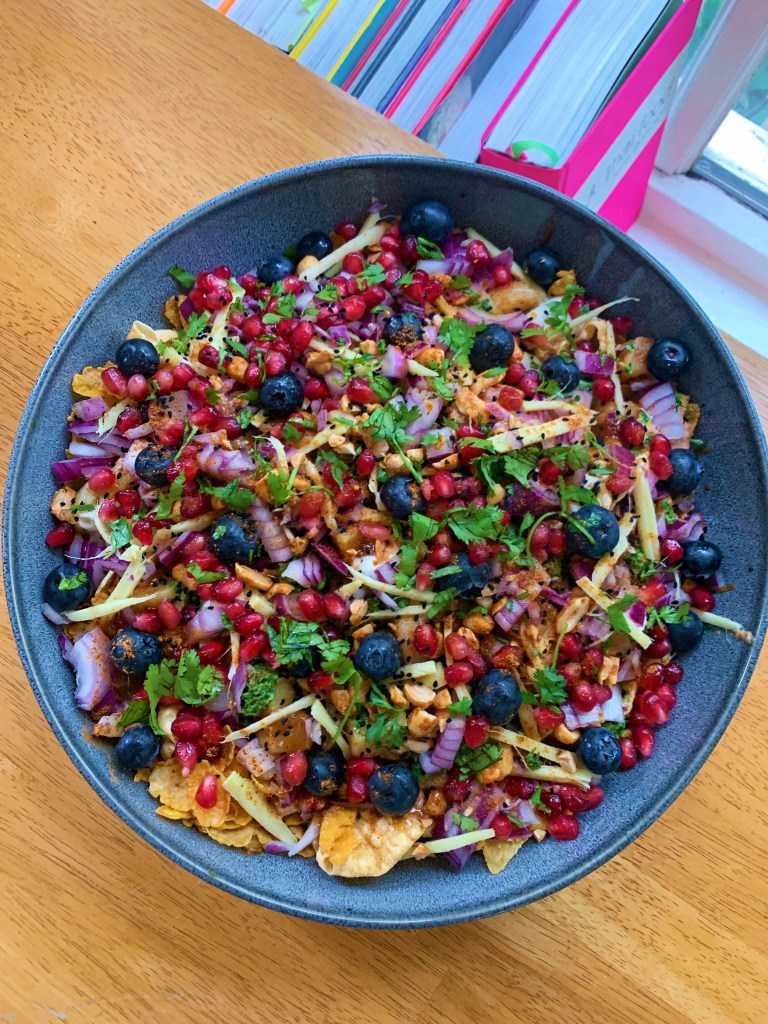 Today I have decided to make an aloo papri chat: cheat’s edition. You can buy raw or cooked papri’s from your Indian shop, however, I have just used papadums and cornflakes, as they are much more readily available and still gives you the crunch. The sauces I have decided to make are chilli mint yoghurt sauce, chilli garlic yoghurt sauce and tamarind sauce. Toppings are usually Indian ‘sev’- a thin crunchy noodle or ‘bhel’- puffed wheat, so you could use this or Bombay mix. I have added blueberries, inspired by the delicious Indian restaurant Tamatanga in Nottingham.