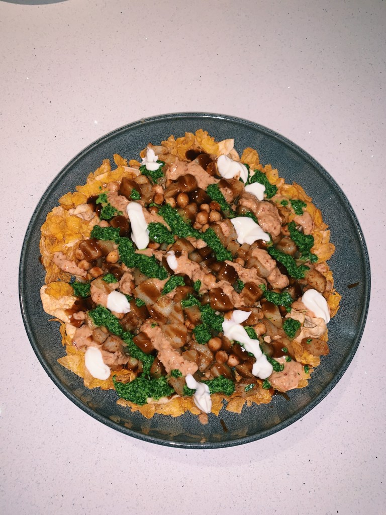 A chaat is a very popular Indian street food snack. Honestly so flavoursome- a perfect mix of sweet, spicy, salty and tangy. There are so many variations of it: samosa chaat, aloo papri chaat etc. Essentially, there is a base to the chaat (usually fried- like a fried puri or papri or a samosa), then topped with boiled potatoes (sometimes with chickpeas), spiced yogurt, sauces and garnishes.