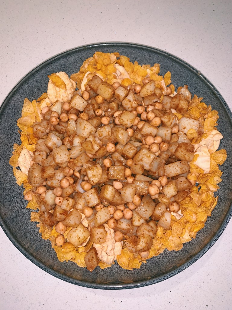 - Add the spiced potatoes and chickpeas on top of the papadums.