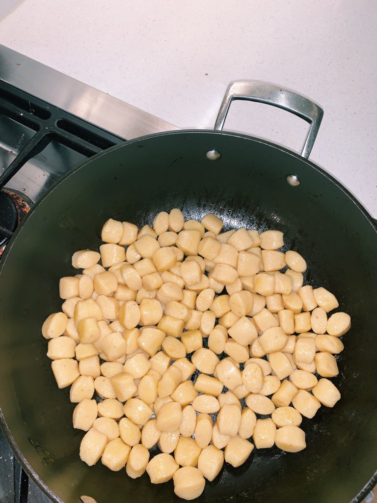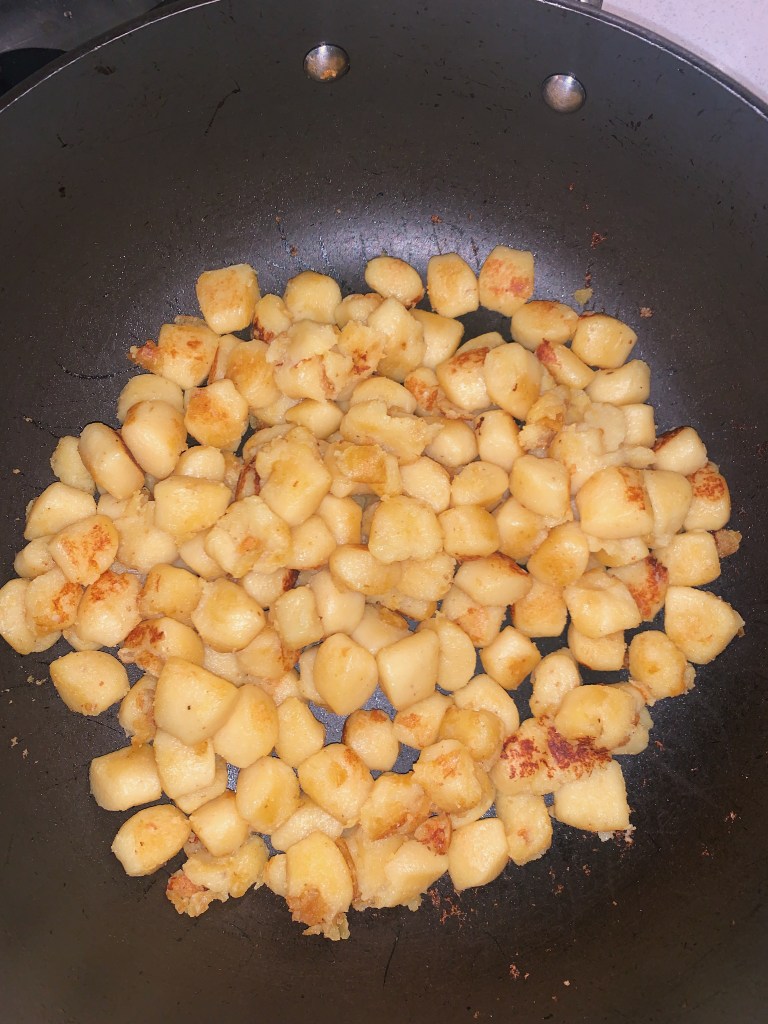 1. Cook the gnocchi by frying it in a little olive oil in a pan on medium heat. Turning them for around 10 minutes until crispy. You can also boil the gnocchi but I think it tastes better when crispy. If you are making ravioli or using dried pasta then cook according to packet instructions.
