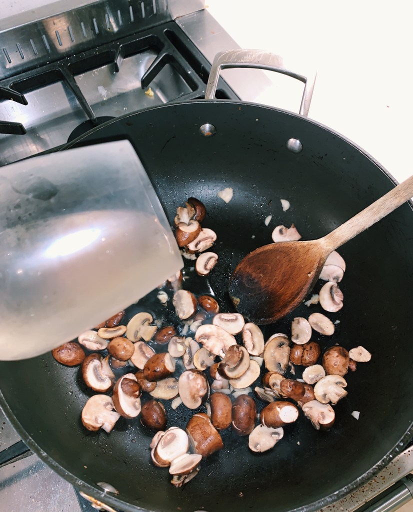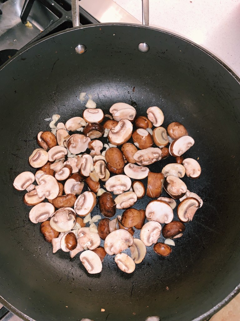2. Make the sauce by adding 1 tbsp of the truffle oil to the pan. Add the garlic and mushrooms. Sauté for a couple of minutes.
