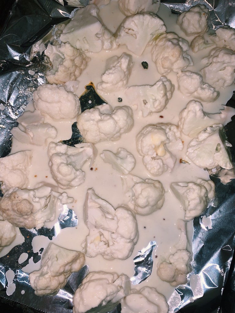 - Once the cauliflower is done and crispy, mix into the sauce.