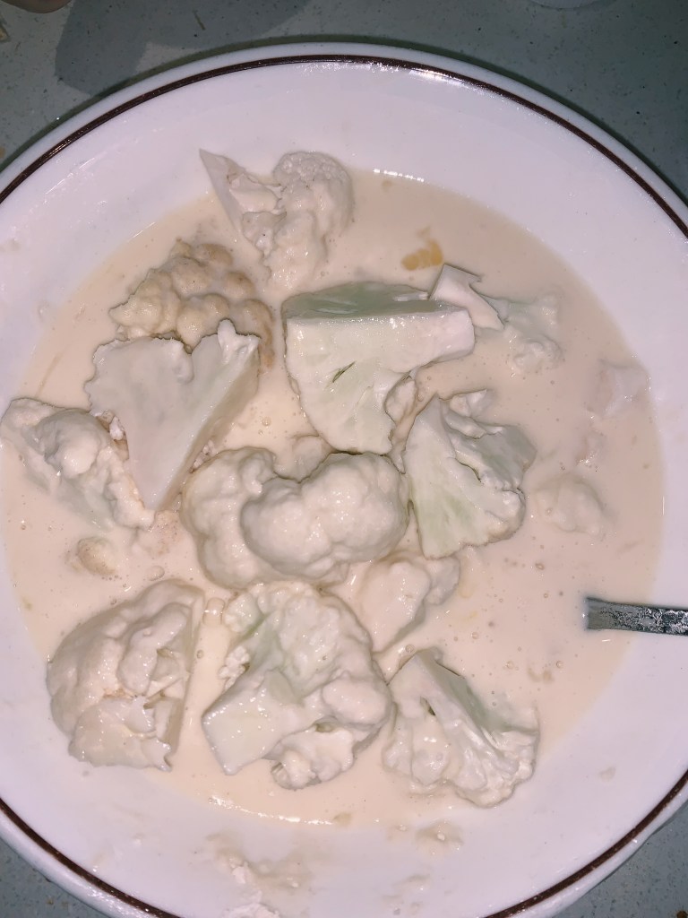 - Add the cauliflower florets to the batter.
