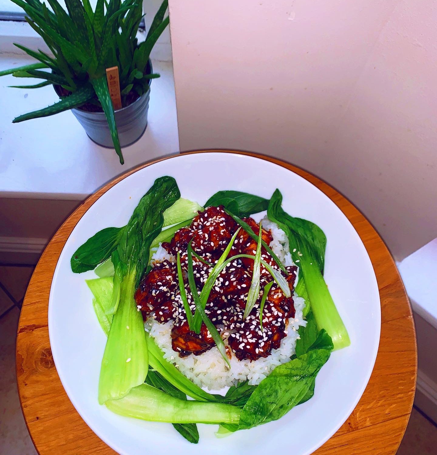 6. Once the sauce is sticky and tastes good, add the chicken in once cooked. Mix until well coated then sprinkle over the sesame seeds and spring onions.