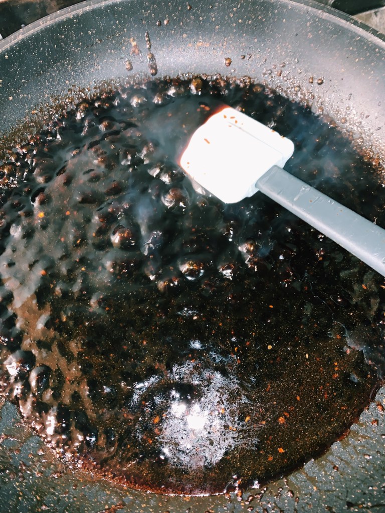 5. Whilst this is cooking, make the sauce by adding all the sauce ingredients (except the cornflour paste) together into a pan and stirring well. Stir for about 5 minutes so the honey is dissolved. Then add the cornflour and stir very well for a few more minutes to remove any lumps. It should start becoming sticky. Taste the sauce to see if it needs more honey or salt (soy sauce).