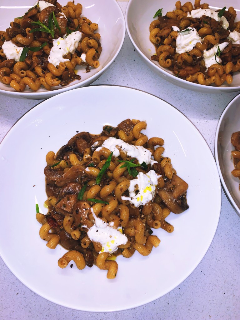 10. Serve out the pasta and add on pieces of burrata, some more truffle oil and the tarragon.