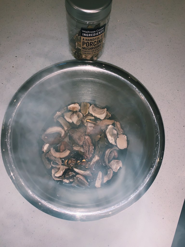 – 1 handful of dried porcini mushrooms (optional)- soaked in hot water for 30 mins beforehand