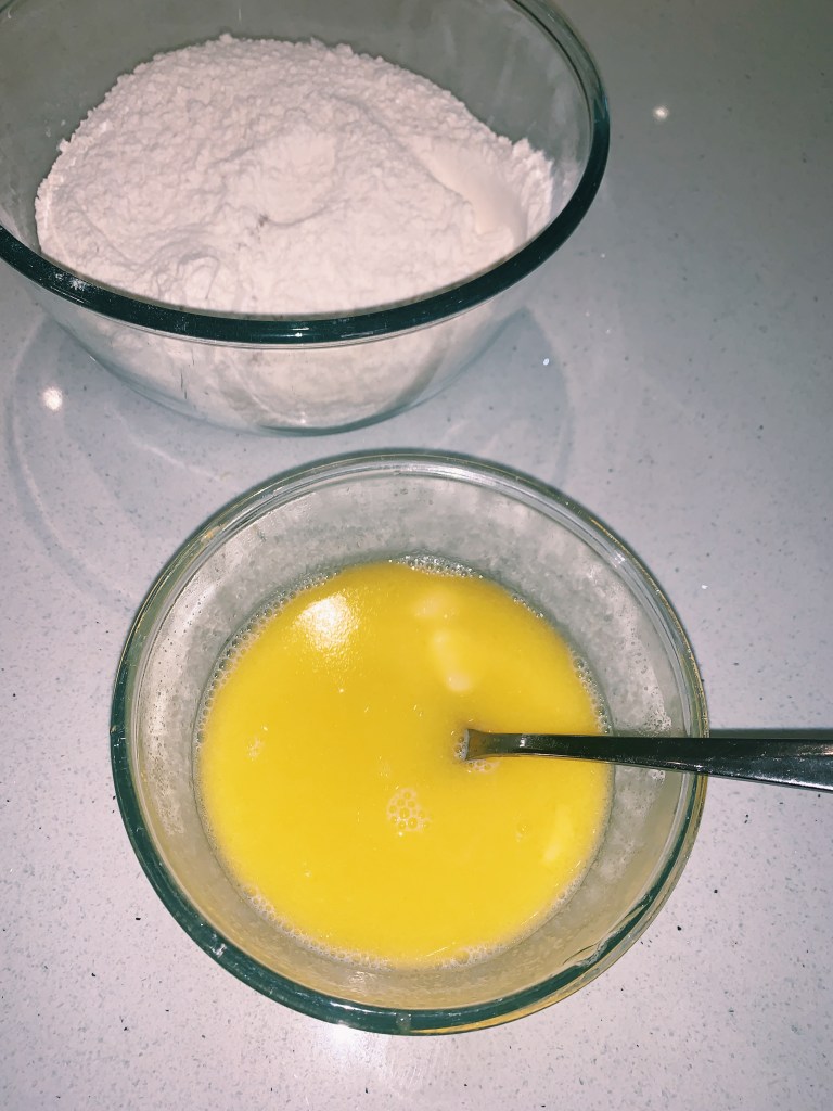 - Then put the wet mix together in a bowl and microwave for about 1 minute, for the butter to melt.