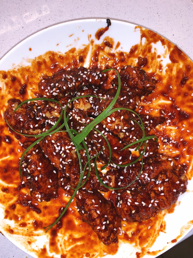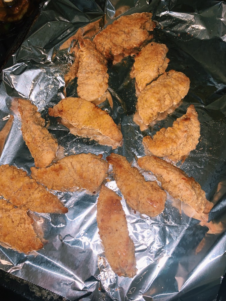 - 8 pieces of breaded oven chicken- make sure you get the 100% chicken ones (or see recipe of KFC “Korean fried cauliflower” on blog)