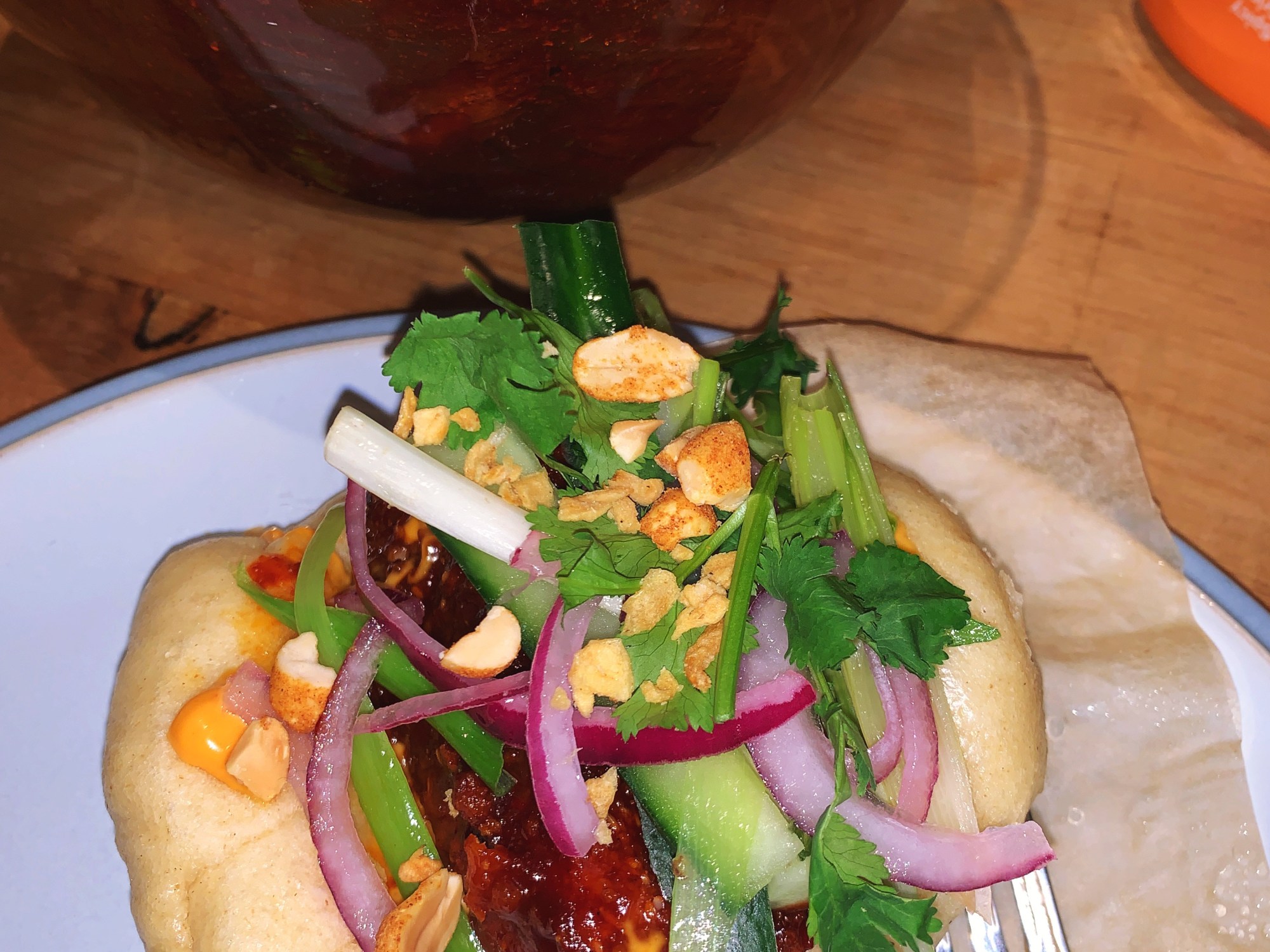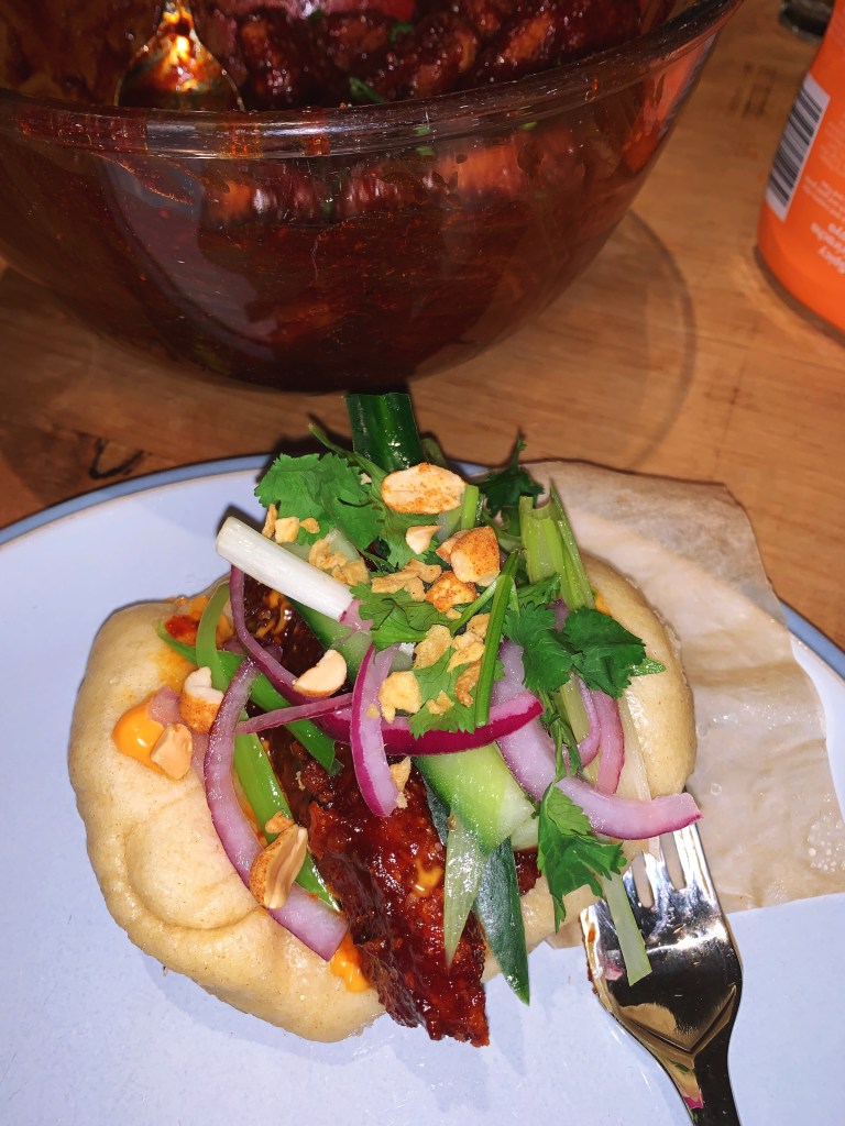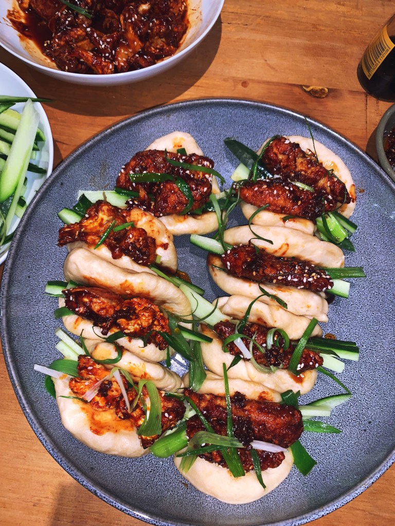 Bao buns have recently become a street food craze- they are pillowy buns (referred to in China as ‘chinese hamburgers’) and are filled with a variety of meats or vegetables. Today I have decided to make a cheat’s fried chicken one- using frozen breaded chicken to avoid the faff of frying it yourself. A veggie one works great with ‘KFC’- korean fried cauliflower popcorn (see other recipe on blog).