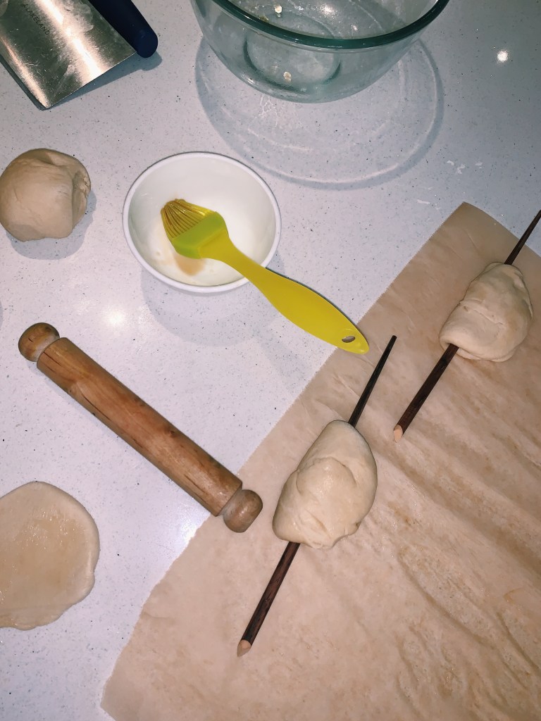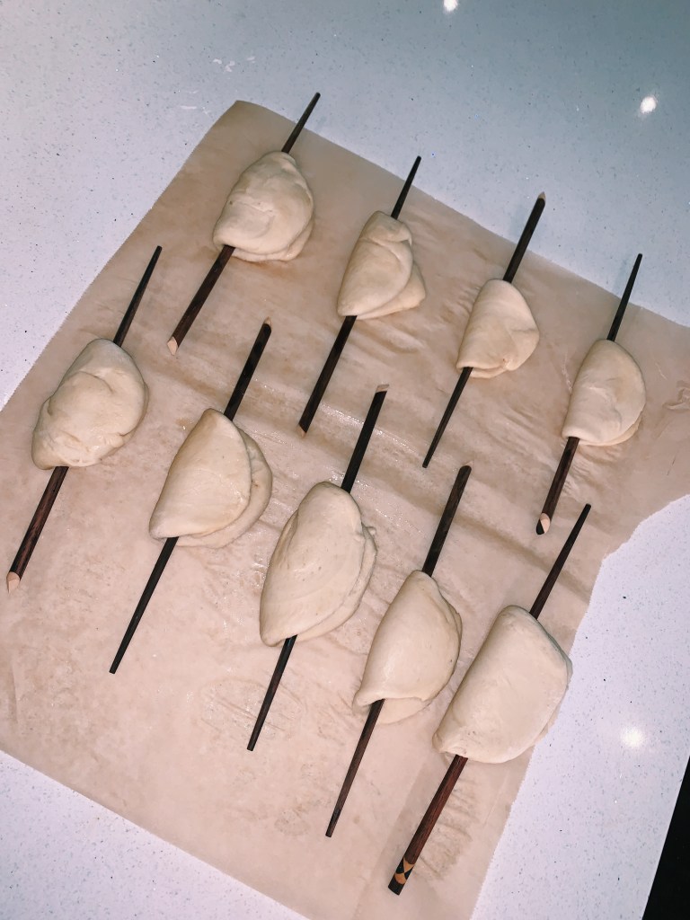 - Place on greaseproof paper, and add a chopstick to hold the bun in place. Leave to rise for a further hour.
