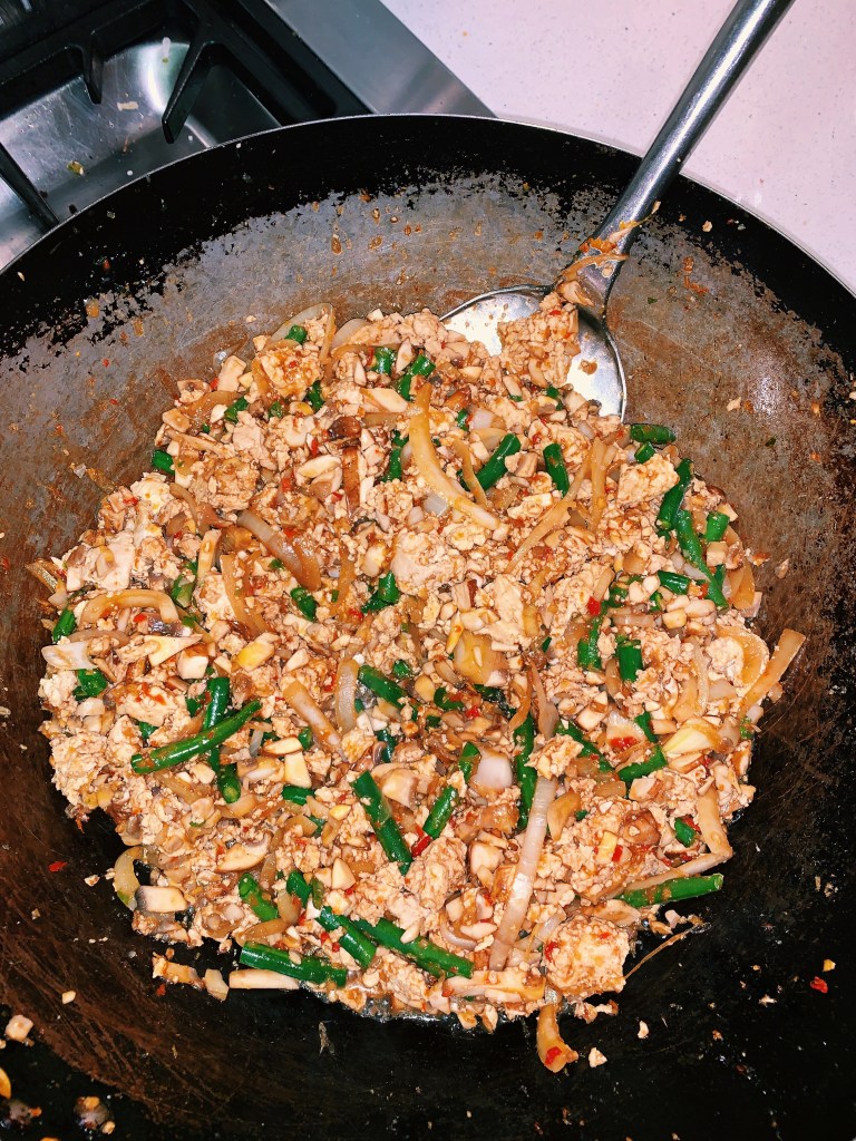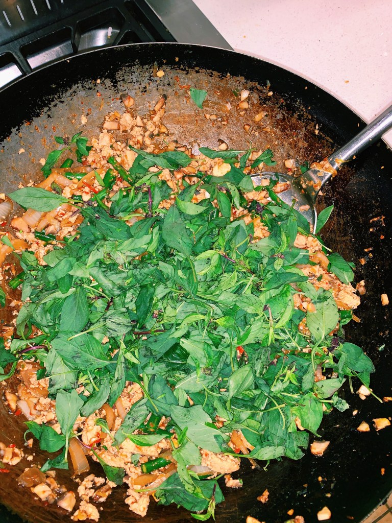 10. At the very last minute, add in your thai basil to the stir fry and take of the heat. Stir well.