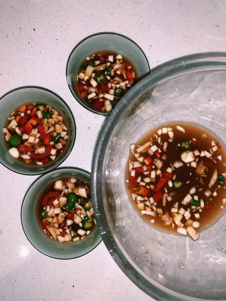 ⁃ Side sauce: (3 garlic cloves- chopped, 3 thai chillies- sliced, 4 tbsp of fish sauce, 4 tbsp of lime juice, 3 tbsp of sugar)