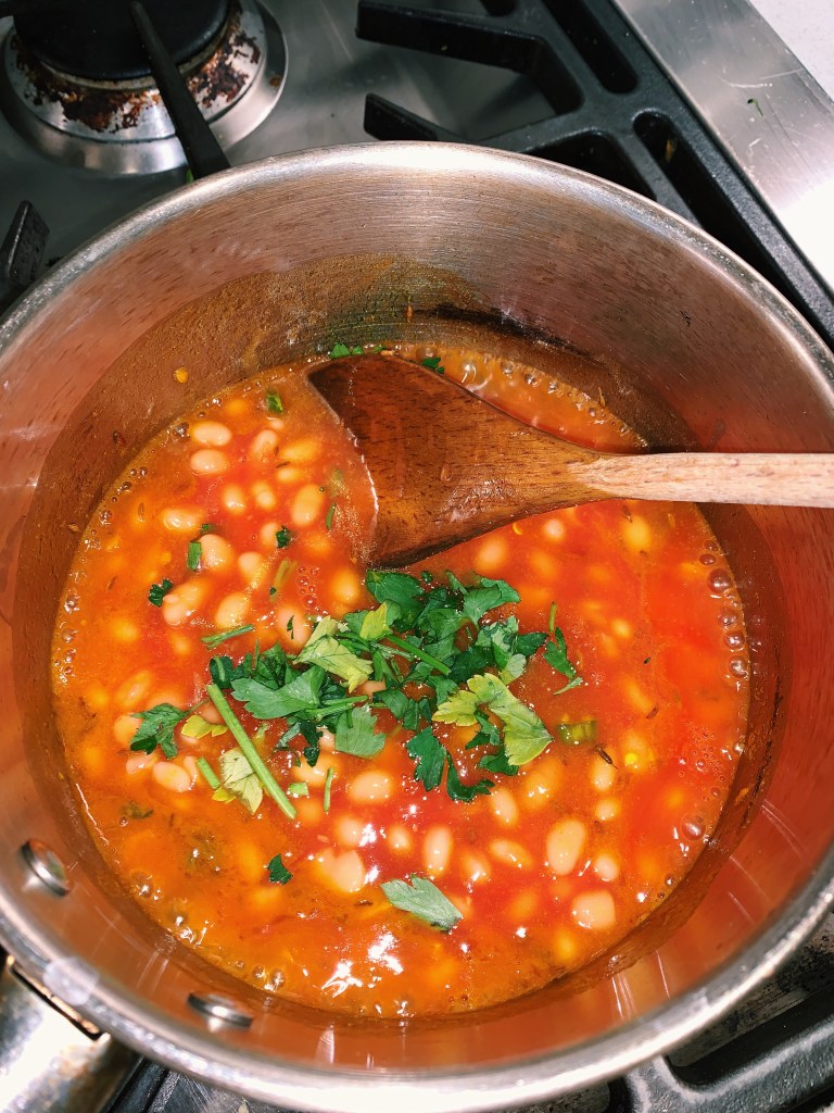 3. For the beans, get a saucepan. Add 1 tsp of oil, 1 tsp cumin seeds, 1 tsp turmeric power, 2 garlic cloves, chopped and 2 green chillies, chopped. Fry together. Add in the baked beans, salt and coriander. Stir until warmed.