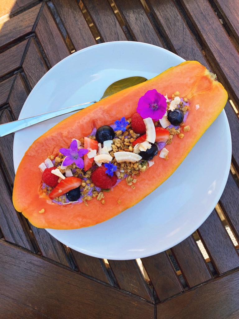 - Pour the smoothie into the papaya halves.