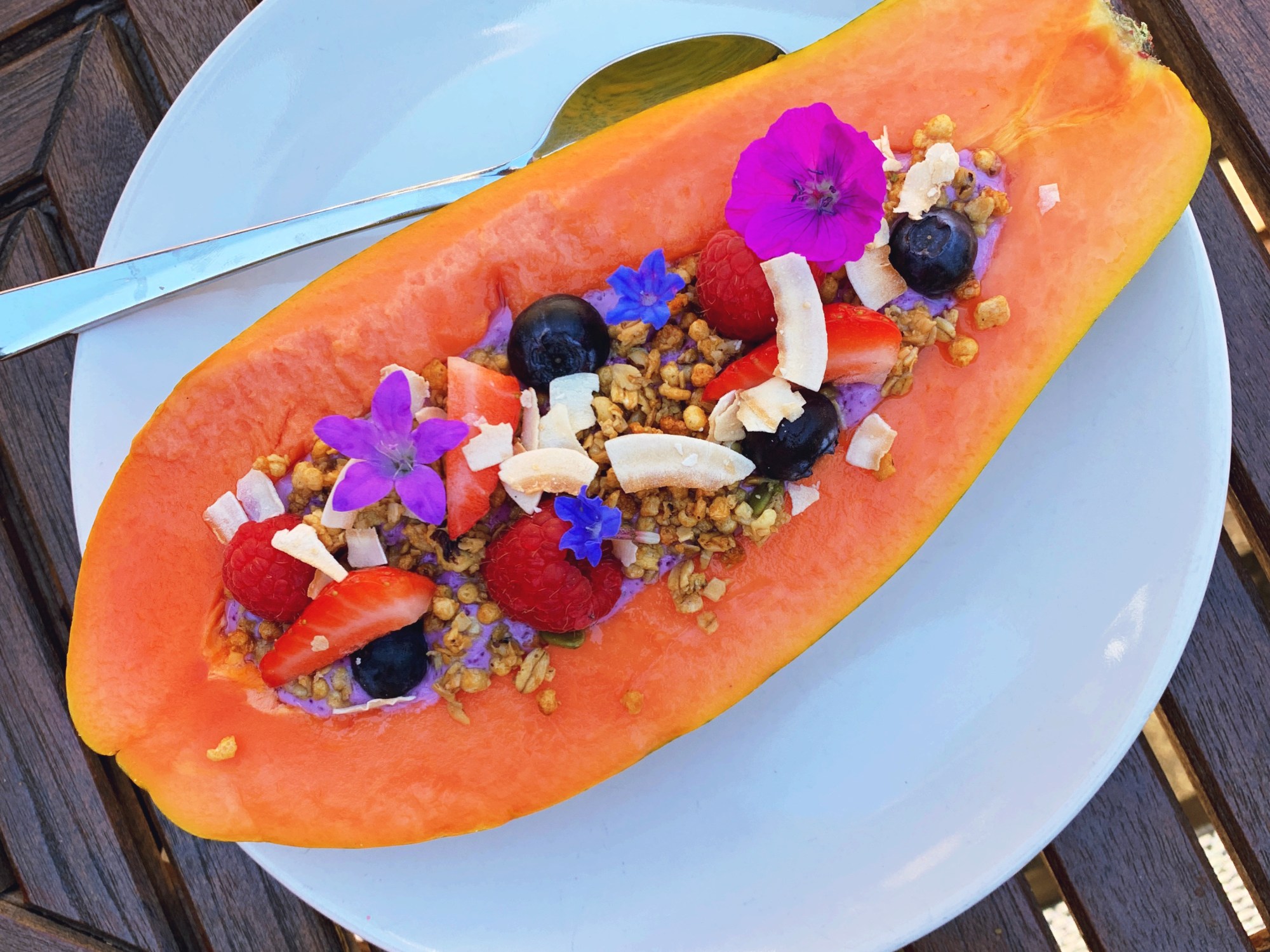 - Pour the smoothie into the papaya halves.