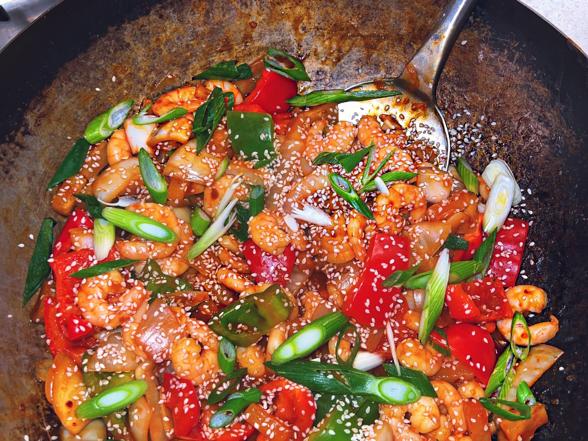 5. Pour the sauce into the wok and coat the prawns and vegetables.