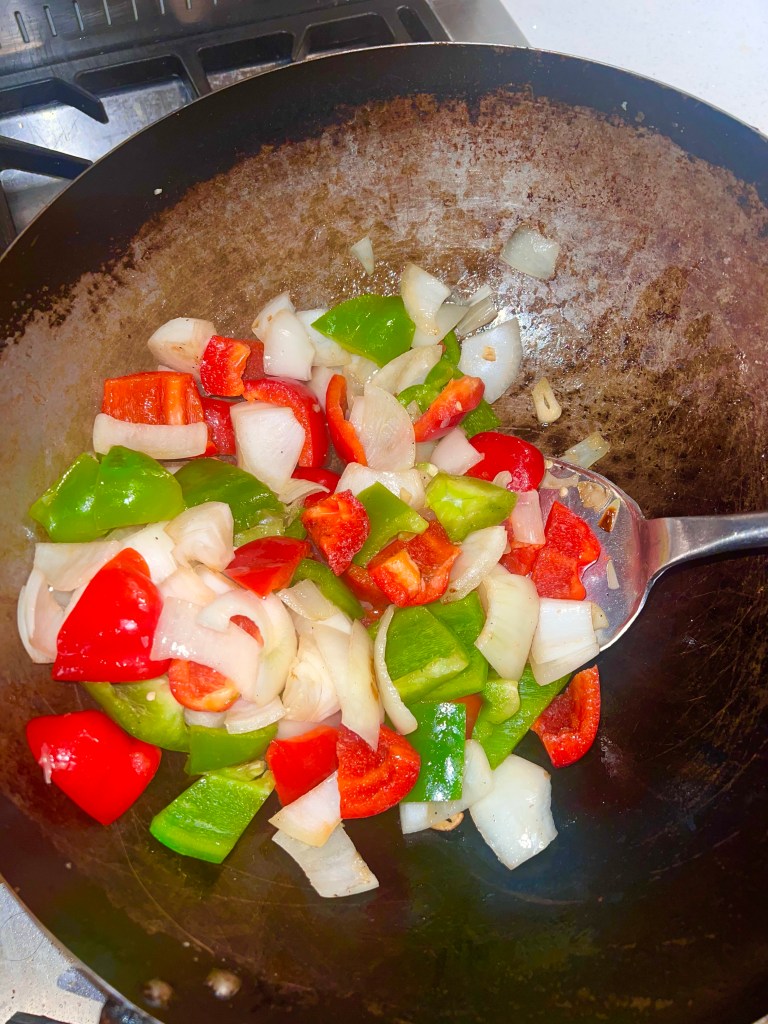 2. Add in the peppers and cook for a few more minutes until starting to get soft.