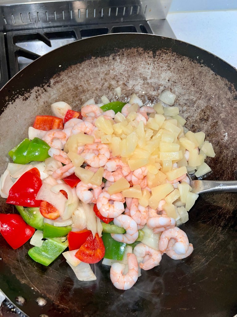 3. Then add in the prawns and pineapple chunks. Stir to combine.